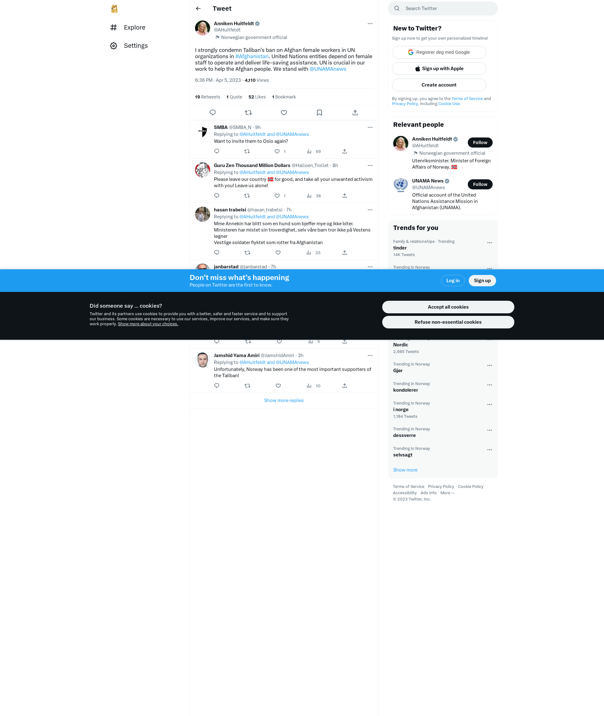 I strongly condemn Taliban’s ban on Afghan female workers in UN organizations in #Afghanistan. United Nations entities depend on female staff to operate and deliver life-saving assistance. UN is crucial in our work to help the Afghan people. We stand with @UNAMAnews