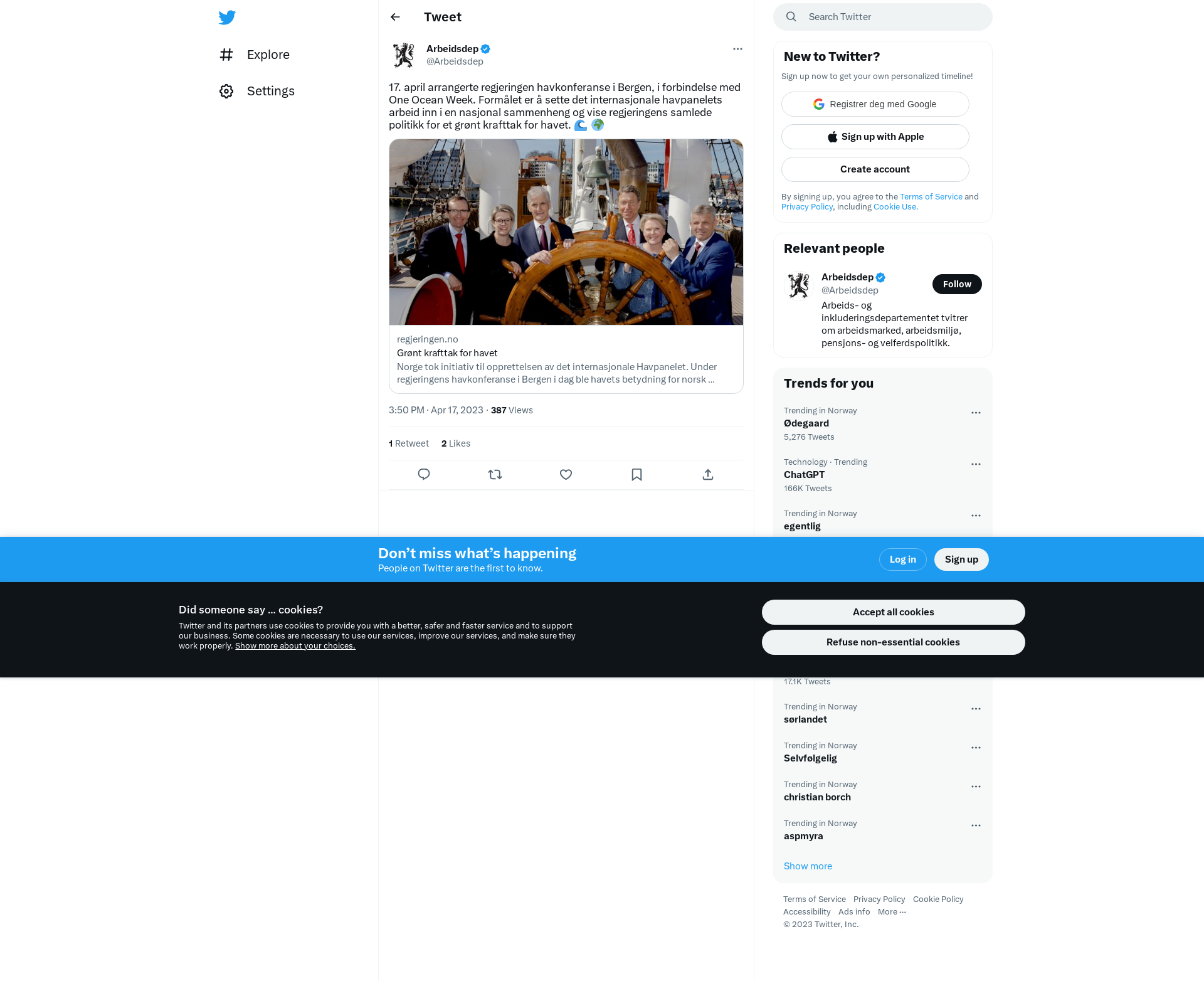 17. april arrangerte regjeringen havkonferanse i Bergen, i forbindelse med One Ocean Week. Formålet er å sette det internasjonale havpanelets arbeid inn i en nasjonal sammenheng og vise regjeringens samlede politikk for et grønt krafttak for havet. 🌊 🌍 \nhttps://t.co/BenXje62I9