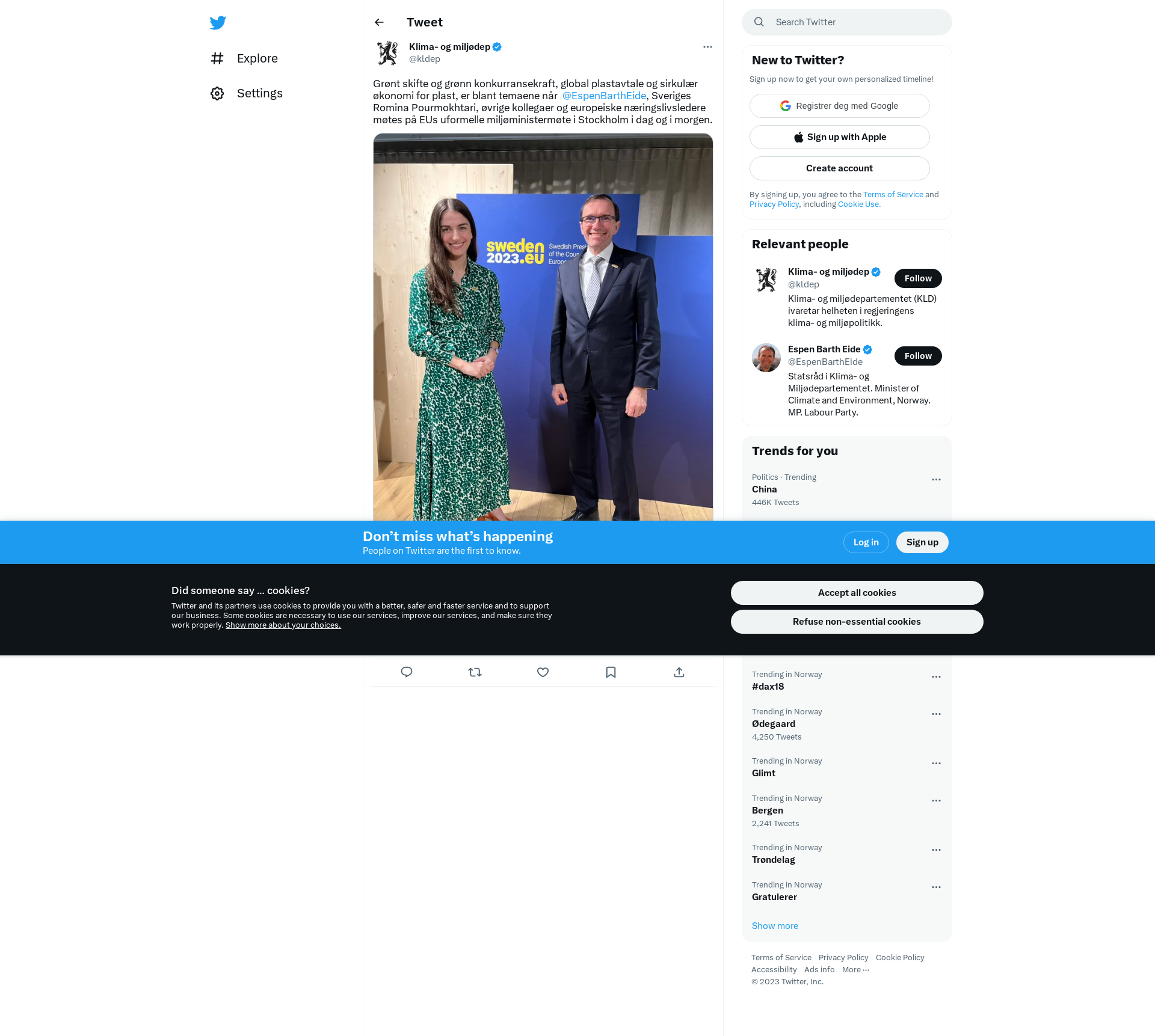 Grønt skifte og grønn konkurransekraft, global plastavtale og sirkulær økonomi for plast, er blant temaene når @EspenBarthEide, Sveriges Romina Pourmokhtari, øvrige kollegaer og europeiske næringslivsledere møtes på EUs uformelle miljøministermøte i Stockholm i dag og i morgen. https://t.co/i9m4YTulEq