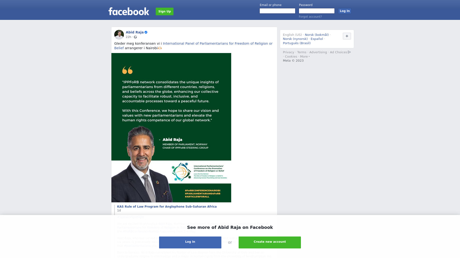 #SpeakerSpotlight \n\nWe are excited to announce Abid Raja, Member of Parliament, Norway and Chair of International Panel of Parliamentarians for Freedom of Religion or Belief Steering Group, as one of our distinguished speakers at the #FoRBConferenceNairobi happening from 1-4 May.\n\nAbid Raja, who has served as the Vice President of the Norwegian Parliament and a prominent litigator for six years, is passionate about advancing freedom of religion or belief for everyone, everywhere. He believes that #parliamentarians play a critical role in this mission.\n\nBorn in Norway, Abid Raja completed his Master of Law degree from the University of Oslo and has an undergraduate degree in criminology and a major in human rights from the University of Southampton. He received the Royal King’s Scholarship to study at the University of Oxford, where he completed his MSc in psychological research.\n\nLearn more about his background and work, including his service as Minister of Culture, Sports and Equality in the Norwegian Government and as a board leader of the Norwegian National Immigration Board, here:\nhttps://www.ippforb.com/events/2023/nairobi\n\n#Parliamentarians4FoRB \n#Article18ForAll