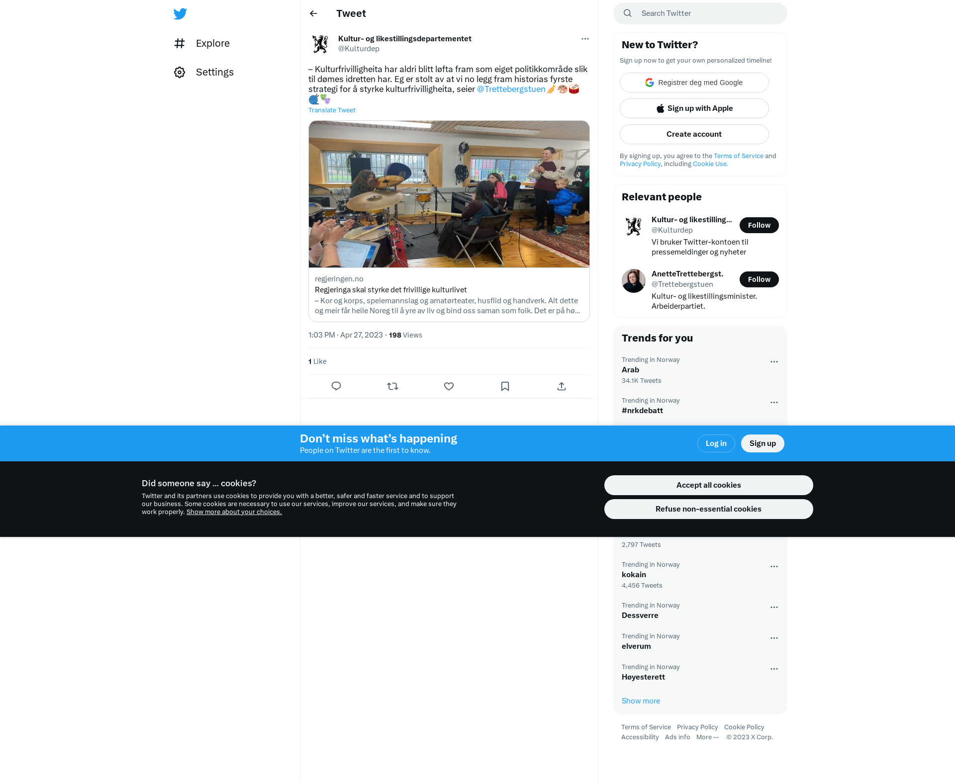 – Kulturfrivilligheita har aldri blitt løfta fram som eiget politikkområde slik til dømes idretten har. Eg er stolt av at vi no legg fram historias fyrste strategi for å styrke kulturfrivilligheita, seier @Trettebergstuen🎺🎨🥁🧶🎭\n\nhttps://t.co/5K1xkRfCyy