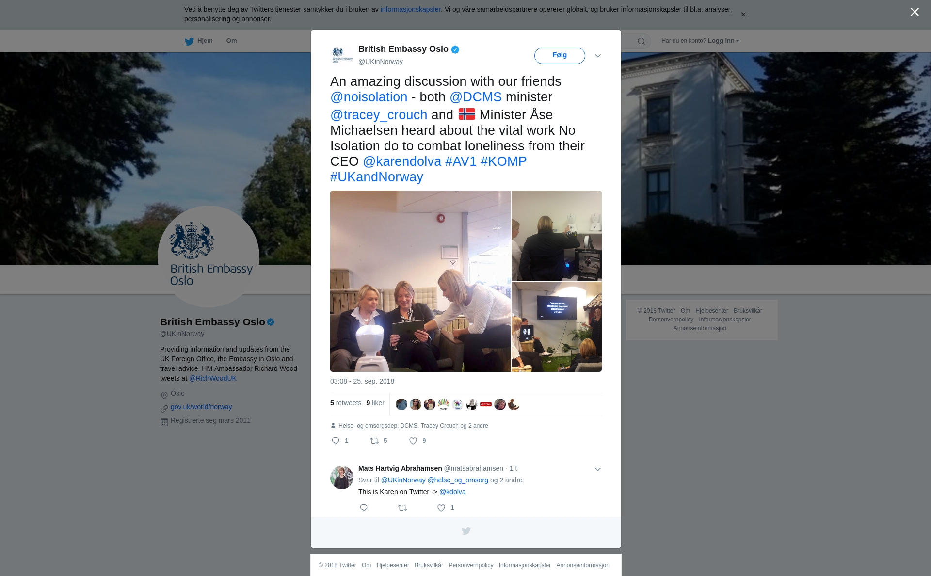RT @UKinNorway: An amazing discussion with our friends @noisolation - both @DCMS minister @tracey_crouch and 🇳🇴 Minister Åse Michaelsen heard about the vital work No Isolation do to combat loneliness from their CEO @karendolva #AV1 #KOMP #UKandNorway https://t.co/Gx3SaZoajP
