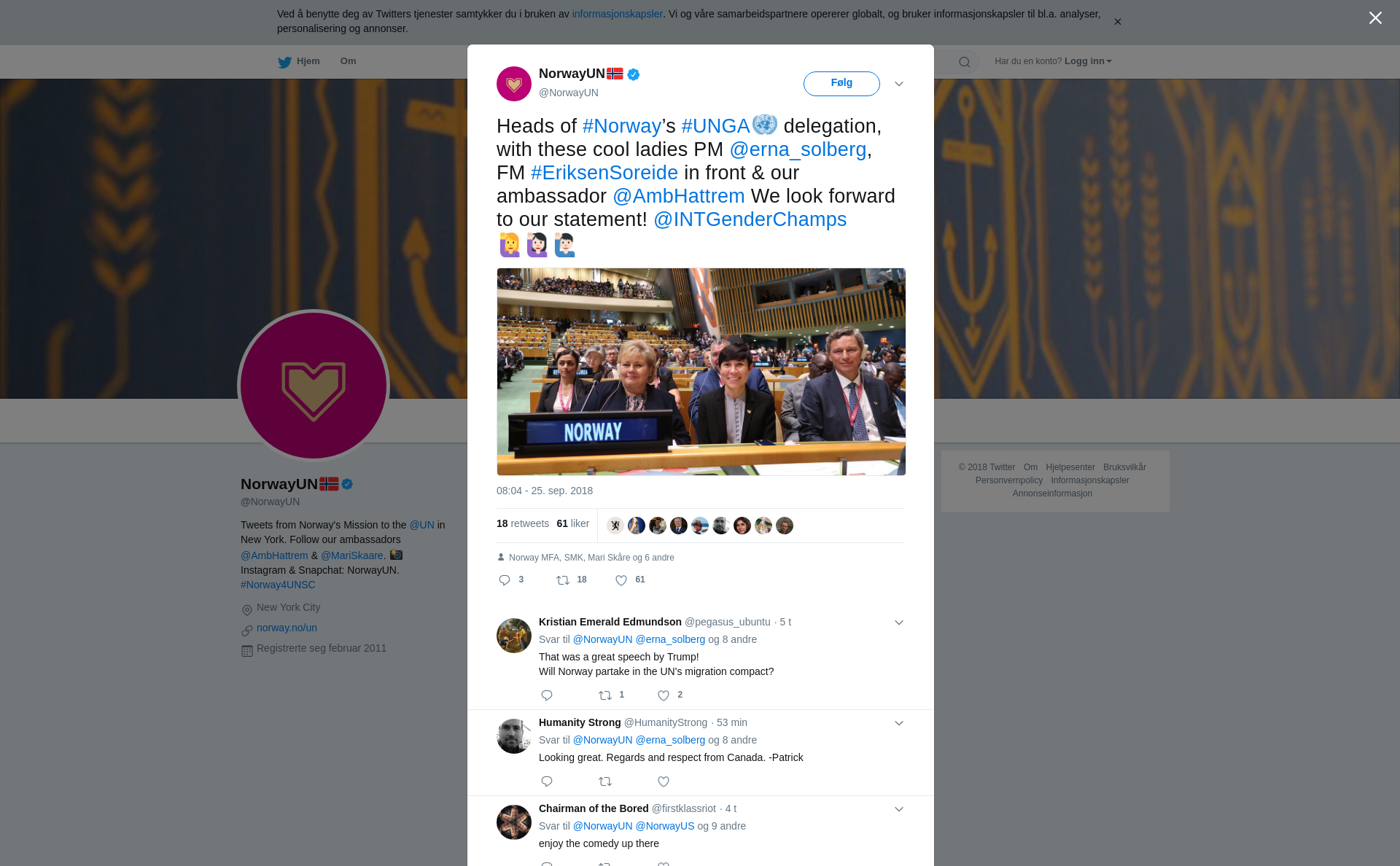 RT @NorwayUN: Heads of #Norway’s #UNGA delegation, with these cool ladies PM @erna_solberg, FM #EriksenSoreide in front & our ambassador @AmbHattrem We look forward to our statement! @INTGenderChamps