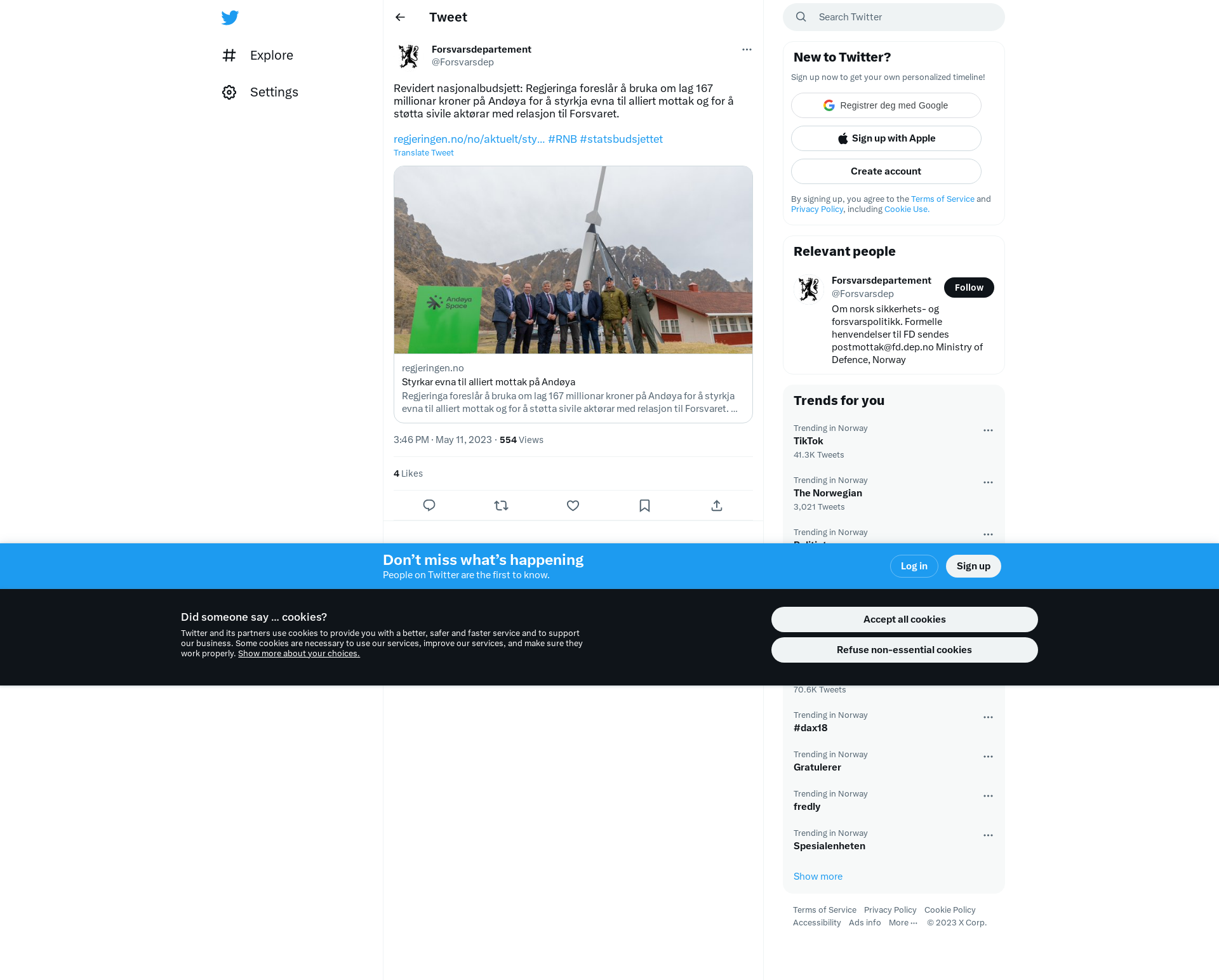 Revidert nasjonalbudsjett: Regjeringa foreslår å bruka om lag 167 millionar kroner på Andøya for å styrkja evna til alliert mottak og for å støtta sivile aktørar med relasjon til Forsvaret.\n\nhttps://t.co/ldgotvBK7T #RNB #statsbudsjettet