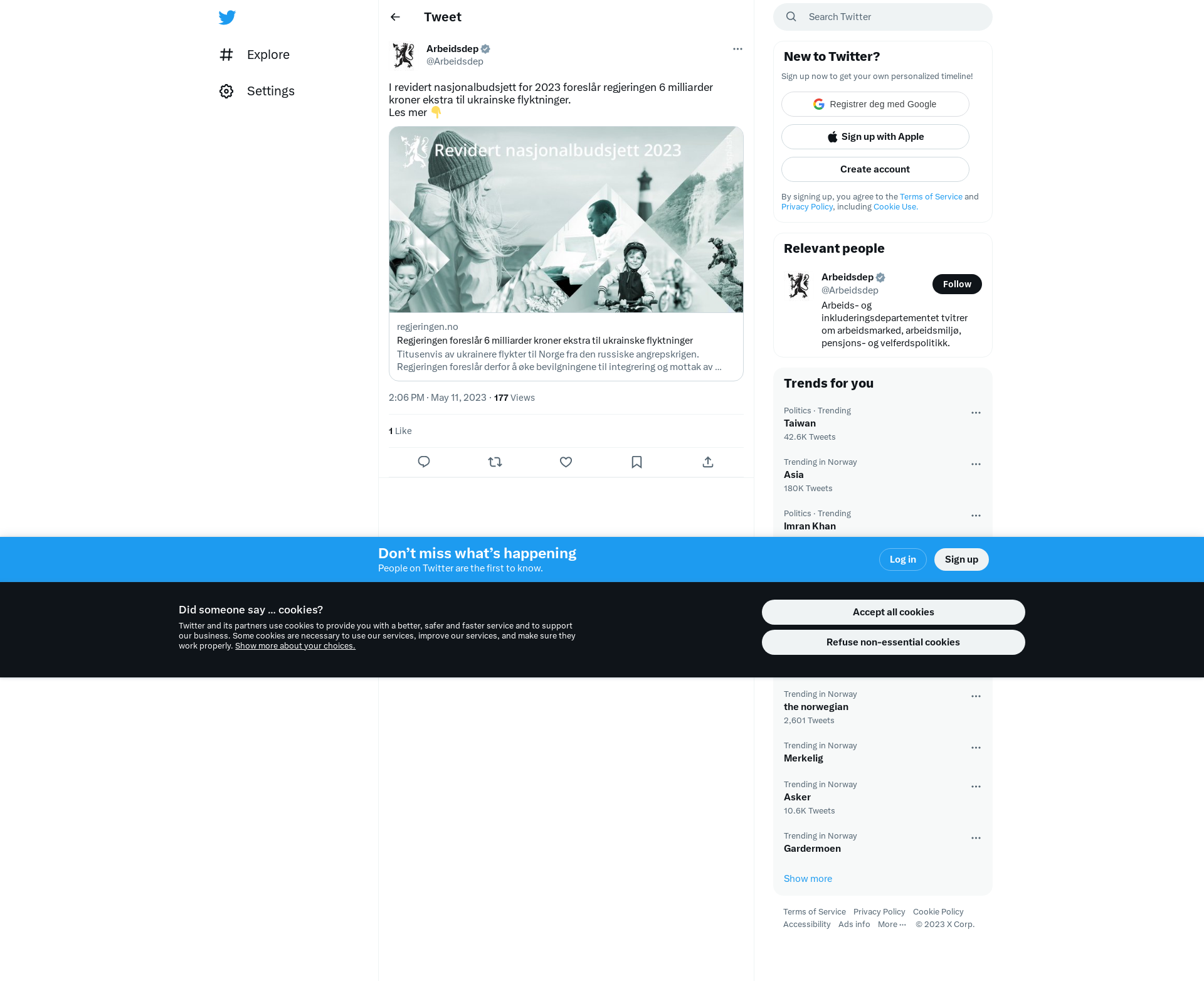 I revidert nasjonalbudsjett for 2023 foreslår regjeringen 6 milliarder kroner ekstra til ukrainske flyktninger. \nLes mer 👇\nhttps://t.co/6QTdu3SKpt
