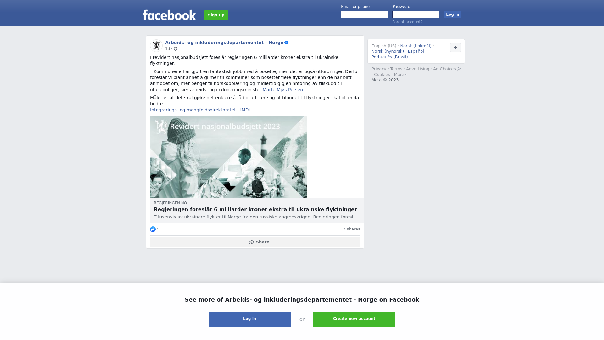 I revidert nasjonalbudsjett foreslår regjeringen 6 milliarder kroner ekstra til ukrainske flyktninger. \n\n– Kommunene har gjort en fantastisk jobb med å bosette, men det er også utfordringer. Derfor foreslår vi blant annet å gi mer til kommuner som bosetter flere flyktninger enn de har blitt anmodet om, mer penger til norskopplæring og midlertidig gjeninnføring av tilskudd til utleieboliger, sier arbeids- og inkluderingsminister Marte Mjøs Persen.\n\nMålet er at det skal gjøre det enklere å få bosatt flere og at tilbudet til flyktninger skal bli enda bedre. \nIntegrerings- og mangfoldsdirektoratet - IMDi