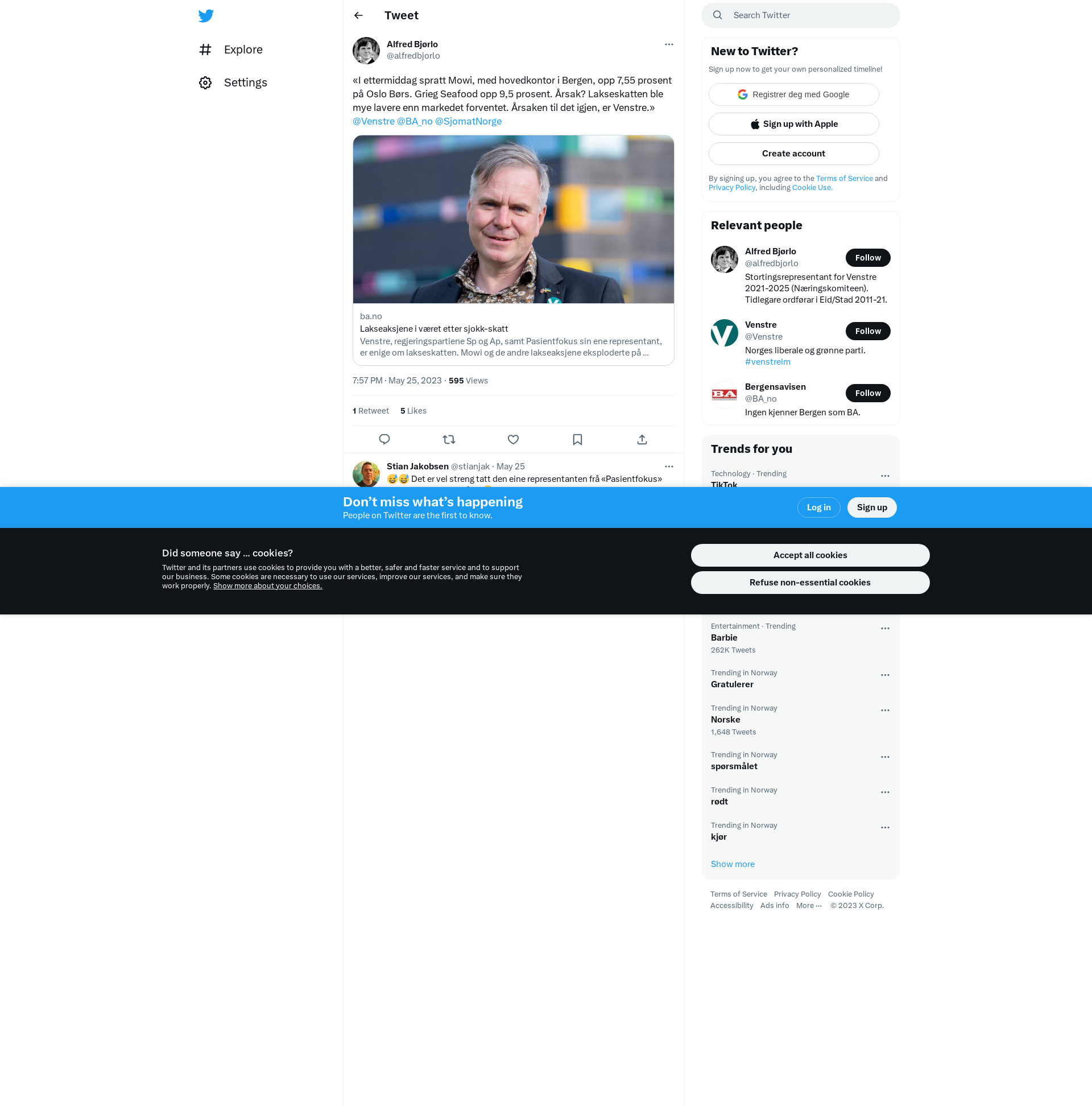 «I ettermiddag spratt Mowi, med hovedkontor i Bergen, opp 7,55 prosent på Oslo Børs. Grieg Seafood opp 9,5 prosent. Årsak? Lakseskatten ble mye lavere enn markedet forventet. Årsaken til det igjen, er Venstre.» @Venstre @BA_no @SjomatNorge https://t.co/9p0zCdkyzn