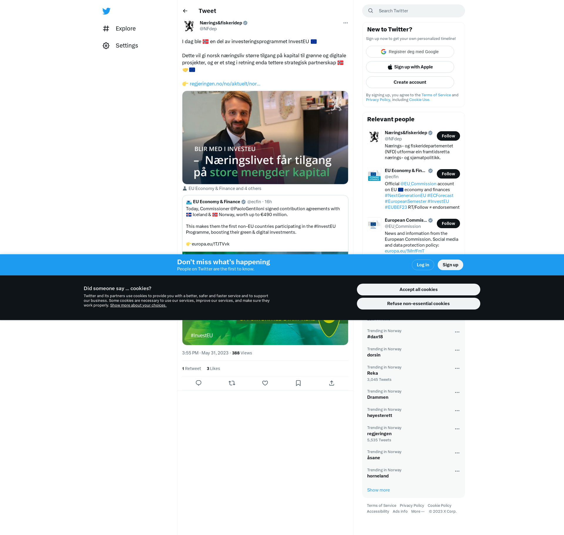 I dag ble 🇳🇴 en del av investeringsprogrammet InvestEU 🇪🇺 \n\nDette vil gi norsk næringsliv større tilgang på kapital til grønne og digitale prosjekter, og er et steg i retning enda tettere strategisk partnerskap 🇳🇴🤝🇪🇺\n\n👉 https://t.co/tS2f5r35Re https://t.co/ckRxcAmx8V