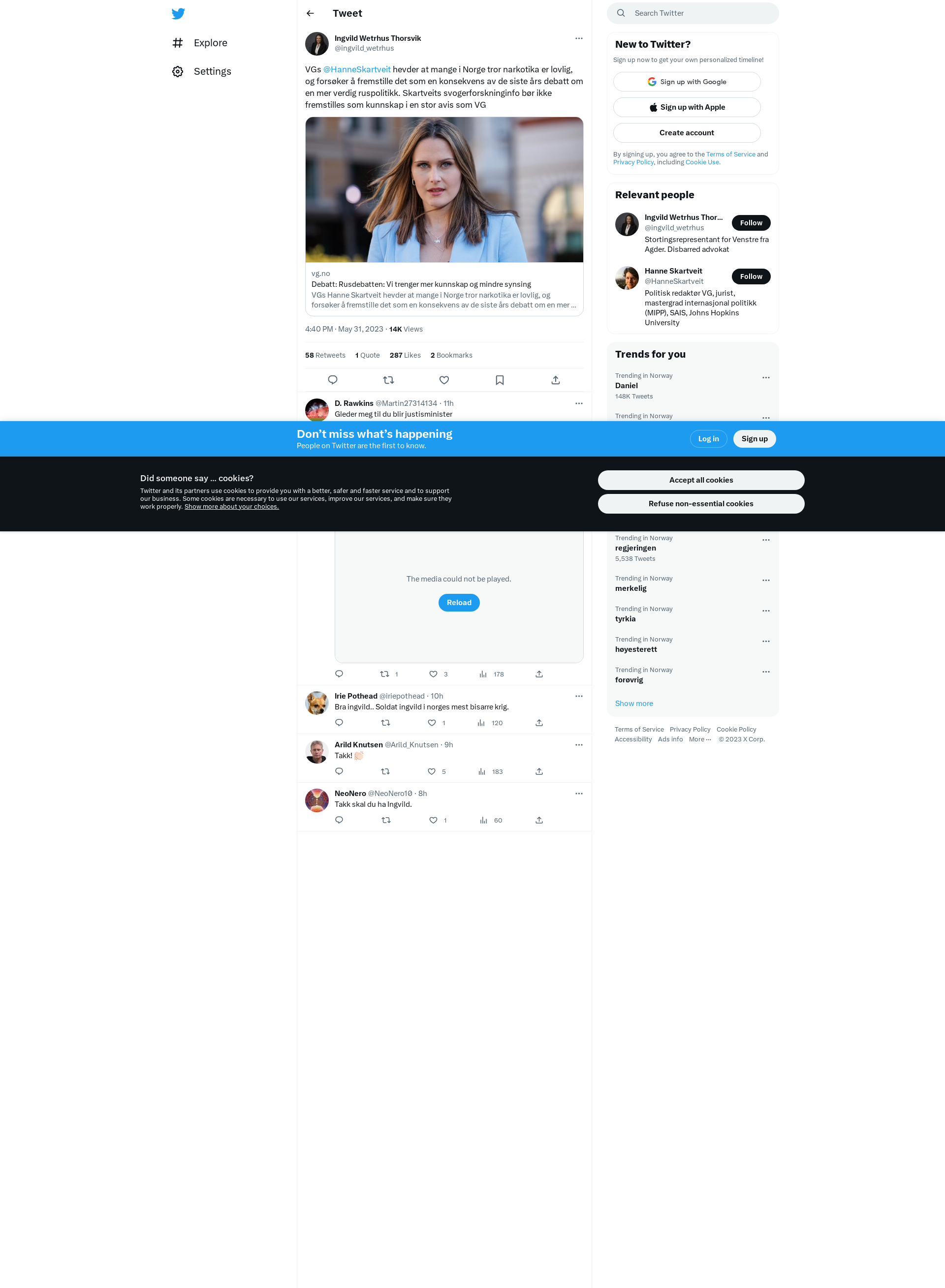 VGs @HanneSkartveit hevder at mange i Norge tror narkotika er lovlig, og forsøker å fremstille det som en konsekvens av de siste års debatt om en mer verdig ruspolitikk. Skartveits svogerforskninginfo bør ikke fremstilles som kunnskap i en stor avis som VG\nhttps://t.co/Rzo6wEqkp1