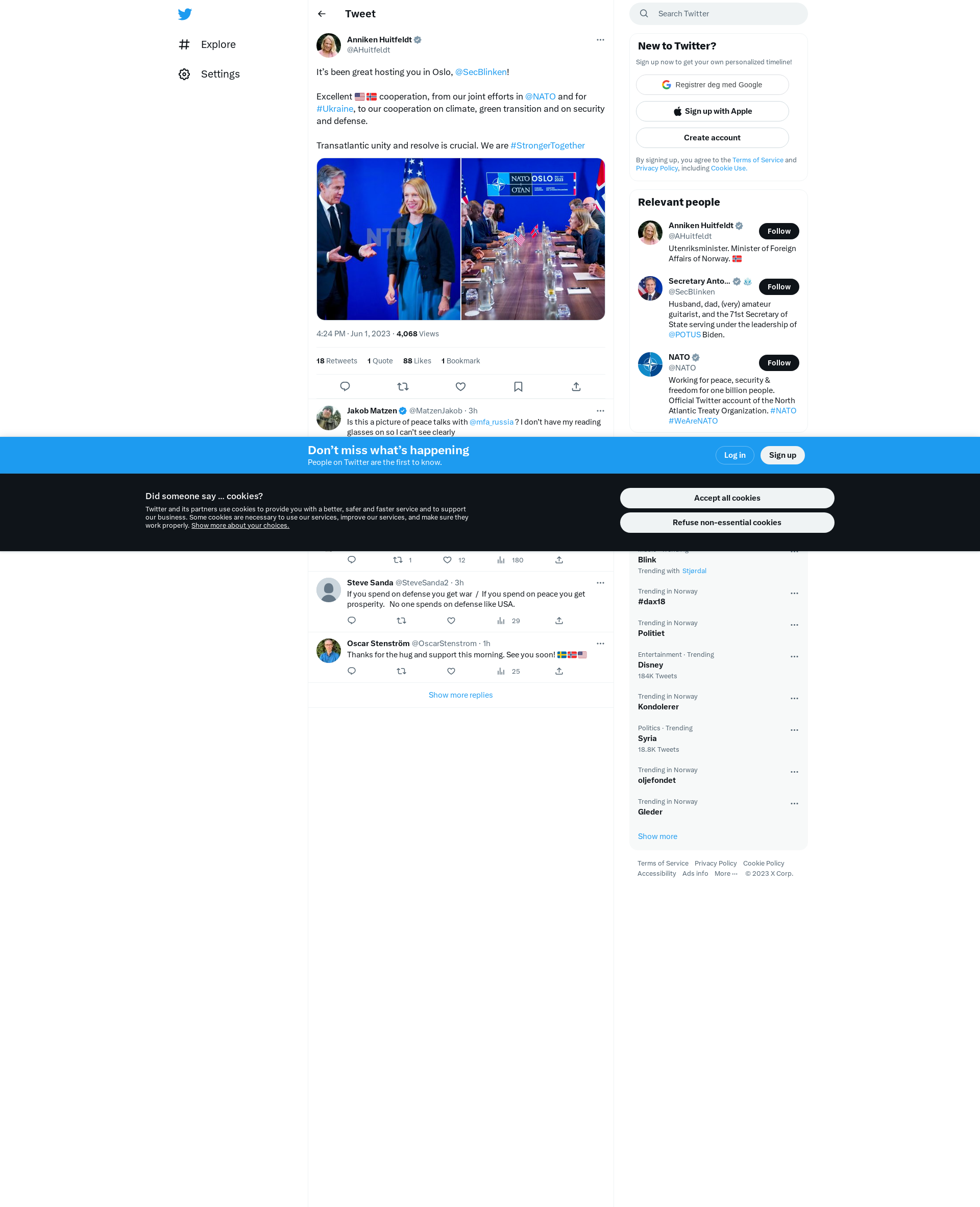 It’s been great hosting you in Oslo, @SecBlinken! \n\nExcellent 🇺🇸🇳🇴 cooperation, from our joint efforts in @NATO and for #Ukraine, to our cooperation on climate, green transition and on security and defense.\n\nTransatlantic unity and resolve is crucial. We are #StrongerTogether https://t.co/JGxM6FpHh3