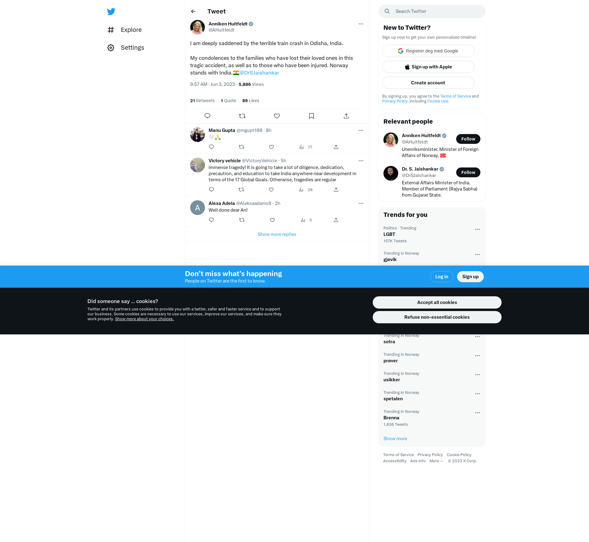 I am deeply saddened by the terrible train crash in Odisha, India. \n\nMy condolences to the families who have lost their loved ones in this tragic accident, as well as to those who have been injured. Norway stands with India.🇮🇳@DrSJaishankar