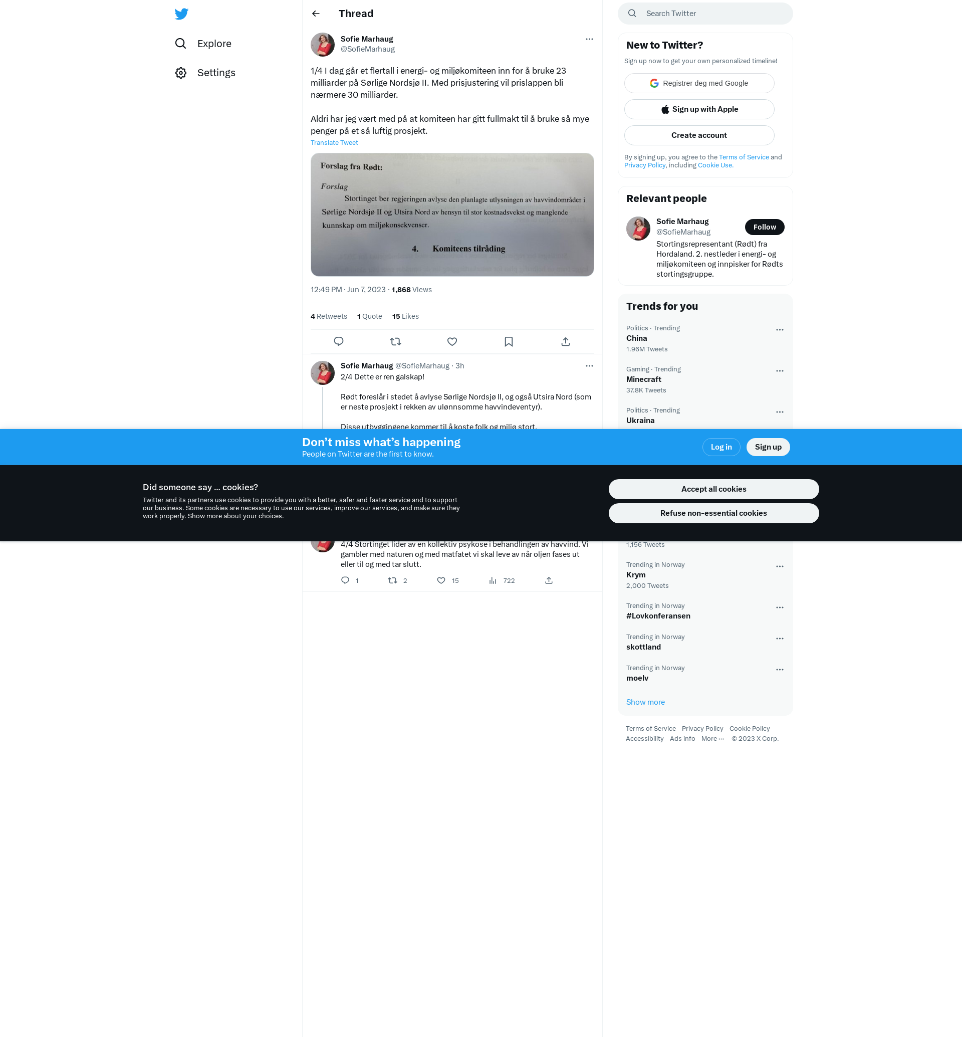 1/4 I dag går et flertall i energi- og miljøkomiteen inn for å bruke 23 milliarder på Sørlige Nordsjø II. Med prisjustering vil prislappen bli nærmere 30 milliarder.\n\nAldri har jeg vært med på at komiteen har gitt fullmakt til å bruke så mye penger på et så luftig prosjekt. https://t.co/5QUJbL35K0