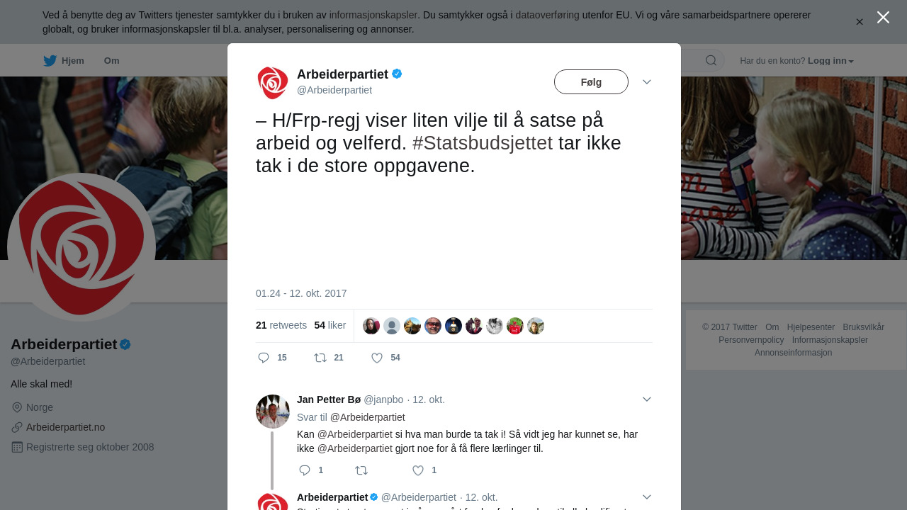 – Høyre og FrP-regjeringen viser liten vilje til å satse på arbeid og velferd. Dette er ikke et statsbudsjett som tar tak i de store oppgavene, sier partileder Jonas Gahr Støre. Støre påpeker at Norge har en stor oppgave i å få flere ut i arbeid, klimautslippene ned, bedre omsorg for de eldre og å få flere elever til å lykkes i skolen. – Det er altfor svak satsing på tidlig innsats og flere lærere i skolen. Det er ingen løft for bedre kvalitet i eldreomsorgen, og regjeringen står fortsatt på at de ikke