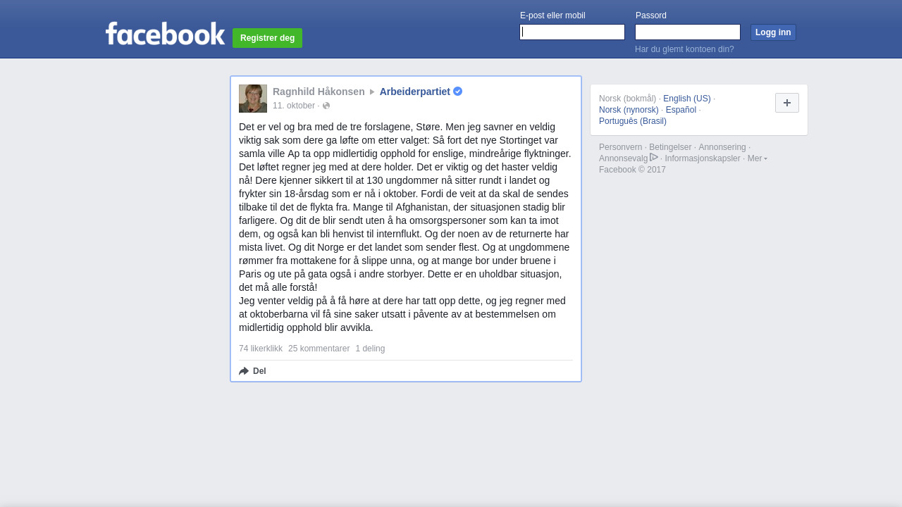 Det er vel og bra med de tre forslagene, Støre. Men jeg savner en veldig viktig sak som dere ga løfte om etter valget: Så fort det nye Stortinget var samla ville Ap ta opp midlertidig opphold for enslige, mindreårige flyktninger. Det løftet regner jeg med at dere holder. Det er viktig og det haster veldig nå! Dere kjenner sikkert til at 130 ungdommer nå sitter rundt i landet og frykter sin 18-årsdag som er nå i oktober. Fordi de veit at da skal de sendes tilbake til det de flykta fra. Mange til Afghanistan, der situasjonen stadig blir farligere. Og dit de blir sendt uten å ha omsorgspersoner som kan ta imot dem, og også kan bli henvist til internflukt. Og der noen av de returnerte har mista livet. Og dit Norge er det landet som sender flest. Og at ungdommene rømmer fra mottakene for å slippe unna, og at mange bor under bruene i Paris og ute på gata også i andre storbyer. Dette er en uholdbar situasjon, det må alle forstå!