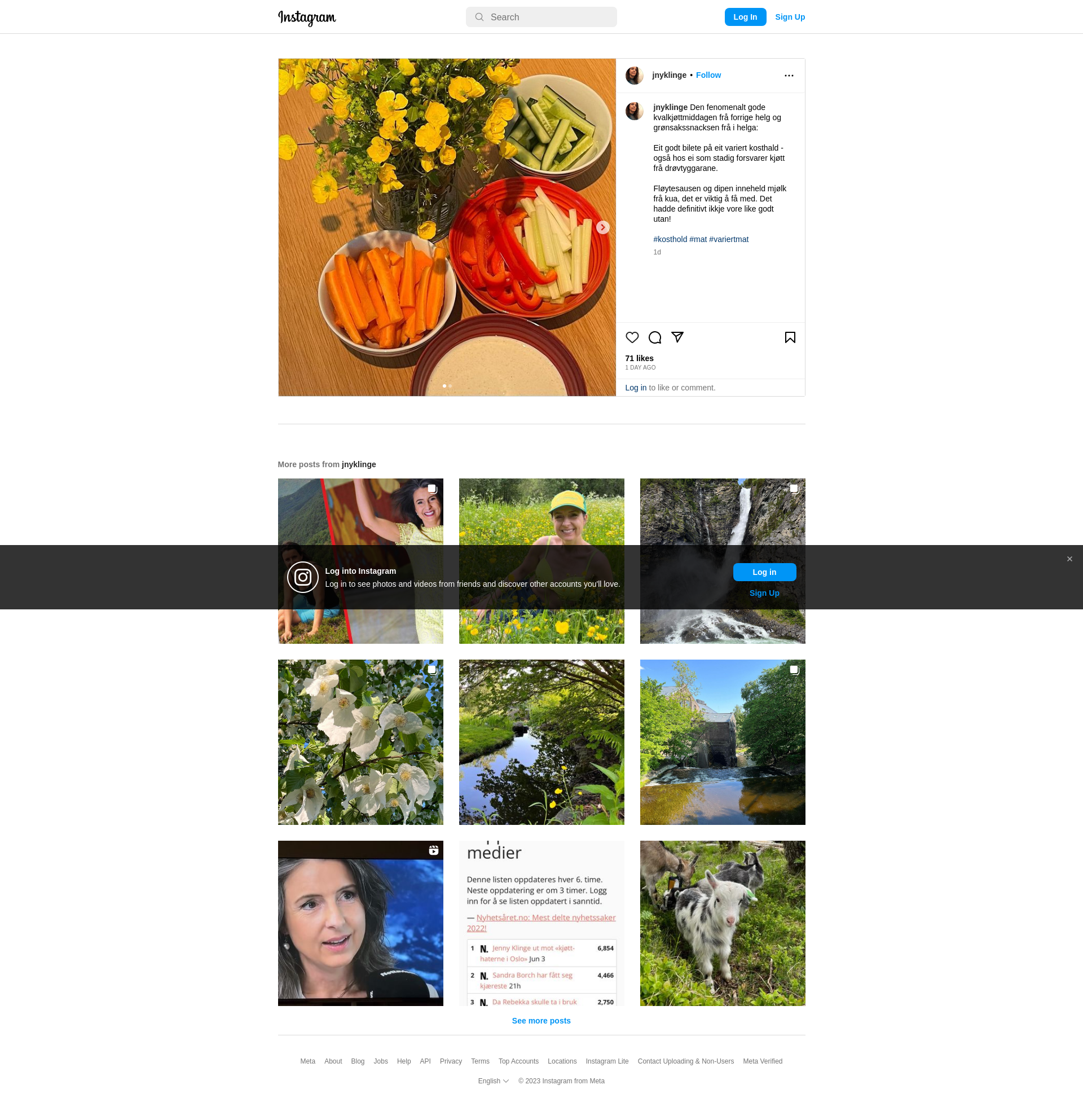Den fenomenalt gode kvalkjøttmiddagen frå forrige helg og grønsakssnacksen frå i helga:\n\nEit godt bilete på eit variert kosthald - også hos ei som stadig forsvarer kjøtt frå drøvtyggarane. \n\nFløytesausen og dipen inneheld mjølk frå kua, det er viktig å få med. Det hadde definitivt ikkje vore like godt utan!\n\n#kosthold #mat #variertmat