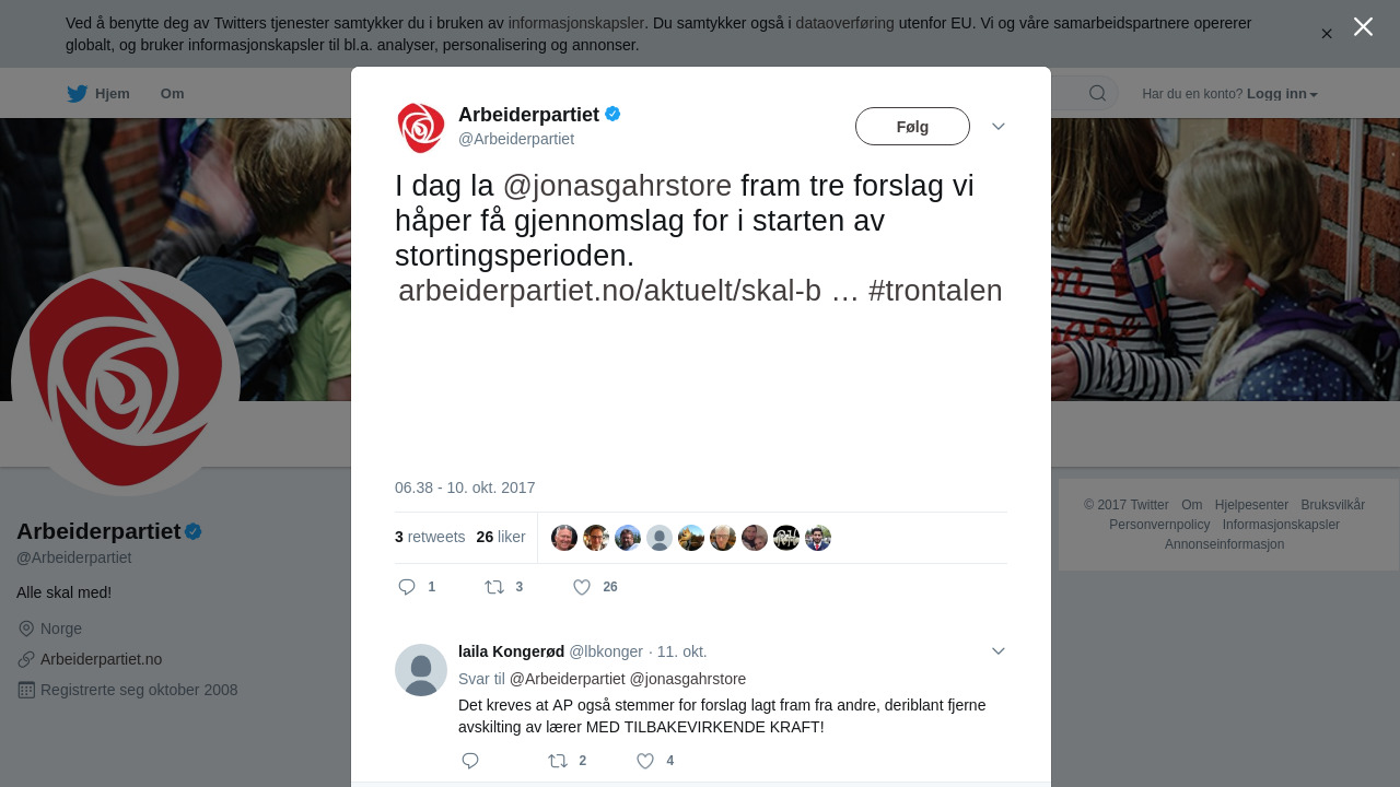 Partileder Jonas Gahr Støre fremmer tre forslag Ap håper på å få gjennomslag for ved starten av den nye stortingsperioden. Trontaledebatten 10. oktober er partienes første mulighet i en ny stortingsperiode til å fremme forslag. Jonas Gahr Støre fremmet på vegne av Arbeiderpartiet tre forslag: Endringer i arbeidsmiljøloven for å begrense bruken av innleid arbeidskraft, læreplass til alle kvalifiserte søkere og 14 ukers pappapermisjon. – Skal vi møte og løse de krevende oppgavene som nå venter, må vi bygge