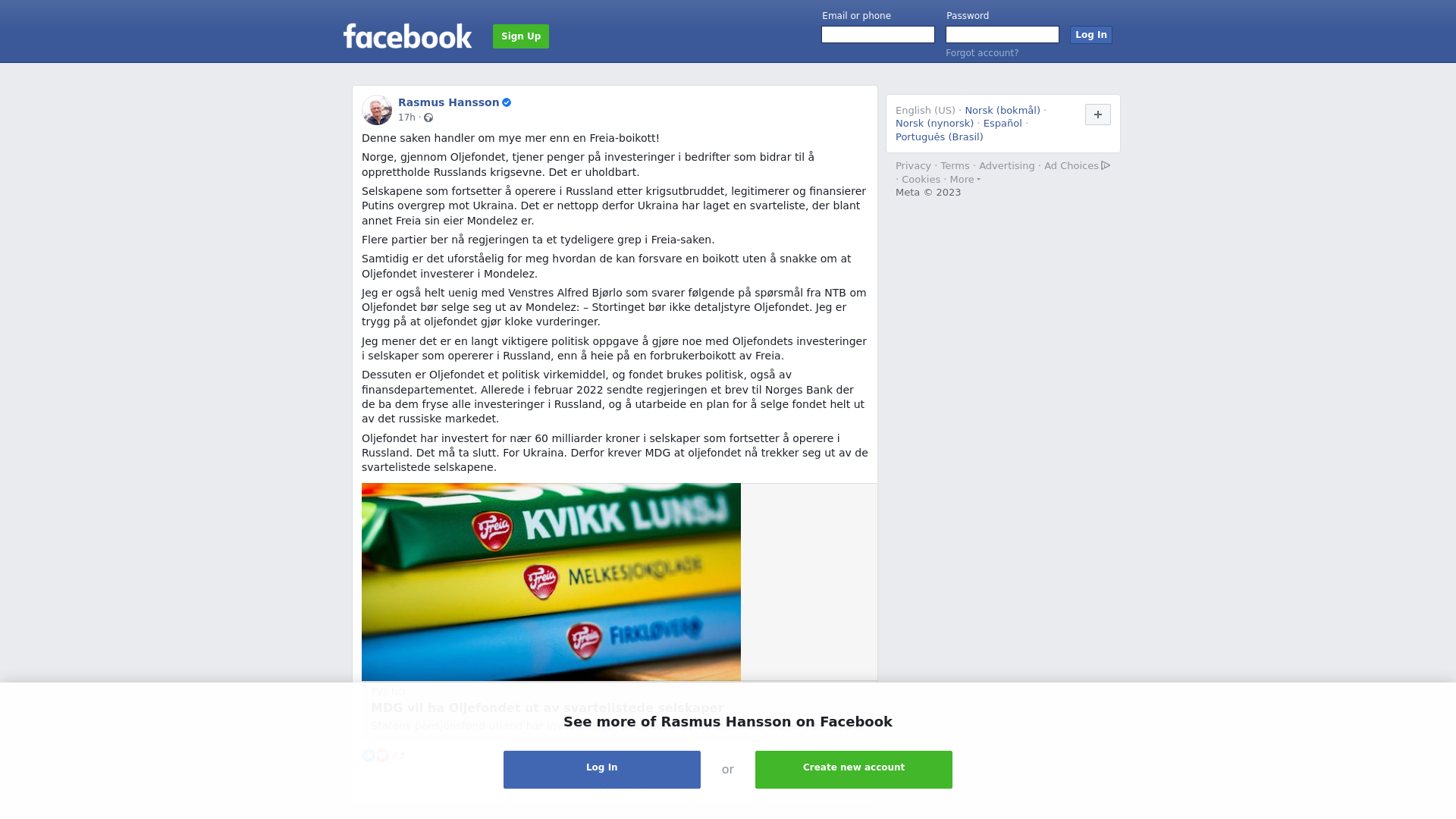 Denne saken handler om mye mer enn en Freia-boikott!\n\nNorge, gjennom Oljefondet, tjener penger på investeringer i bedrifter som bidrar til å opprettholde Russlands krigsevne. Det er uholdbart.\n\nSelskapene som fortsetter å operere i Russland etter krigsutbruddet, legitimerer og finansierer Putins overgrep mot Ukraina. Det er nettopp derfor Ukraina har laget en svarteliste, der blant annet Freia sin eier Mondelez er. \n\nFlere partier ber nå regjeringen ta et tydeligere grep i Freia-saken.\n\nSamtidig er det uforståelig for meg hvordan de kan forsvare en boikott uten å snakke om at Oljefondet investerer i Mondelez.\n\nJeg er også helt uenig med Venstres Alfred Bjørlo som svarer følgende på spørsmål fra NTB om Oljefondet bør selge seg ut av Mondelez: – Stortinget bør ikke detaljstyre Oljefondet. Jeg er trygg på at oljefondet gjør kloke vurderinger.\n\nJeg mener det er en langt viktigere politisk oppgave å gjøre noe med Oljefondets investeringer i selskaper som opererer i Russland, enn å heie på en forbrukerboikott av Freia.\n\nDessuten er Oljefondet et politisk virkemiddel, og fondet brukes politisk, også av finansdepartementet. Allerede i februar 2022 sendte regjeringen et brev til Norges Bank der de ba dem fryse alle investeringer i Russland, og å utarbeide en plan for å selge fondet helt ut av det russiske markedet.\n\nOljefondet har investert for nær 60 milliarder kroner i selskaper som fortsetter å operere i Russland. Det må ta slutt. For Ukraina. Derfor krever MDG at oljefondet nå trekker seg ut av de svartelistede selskapene. \n\n