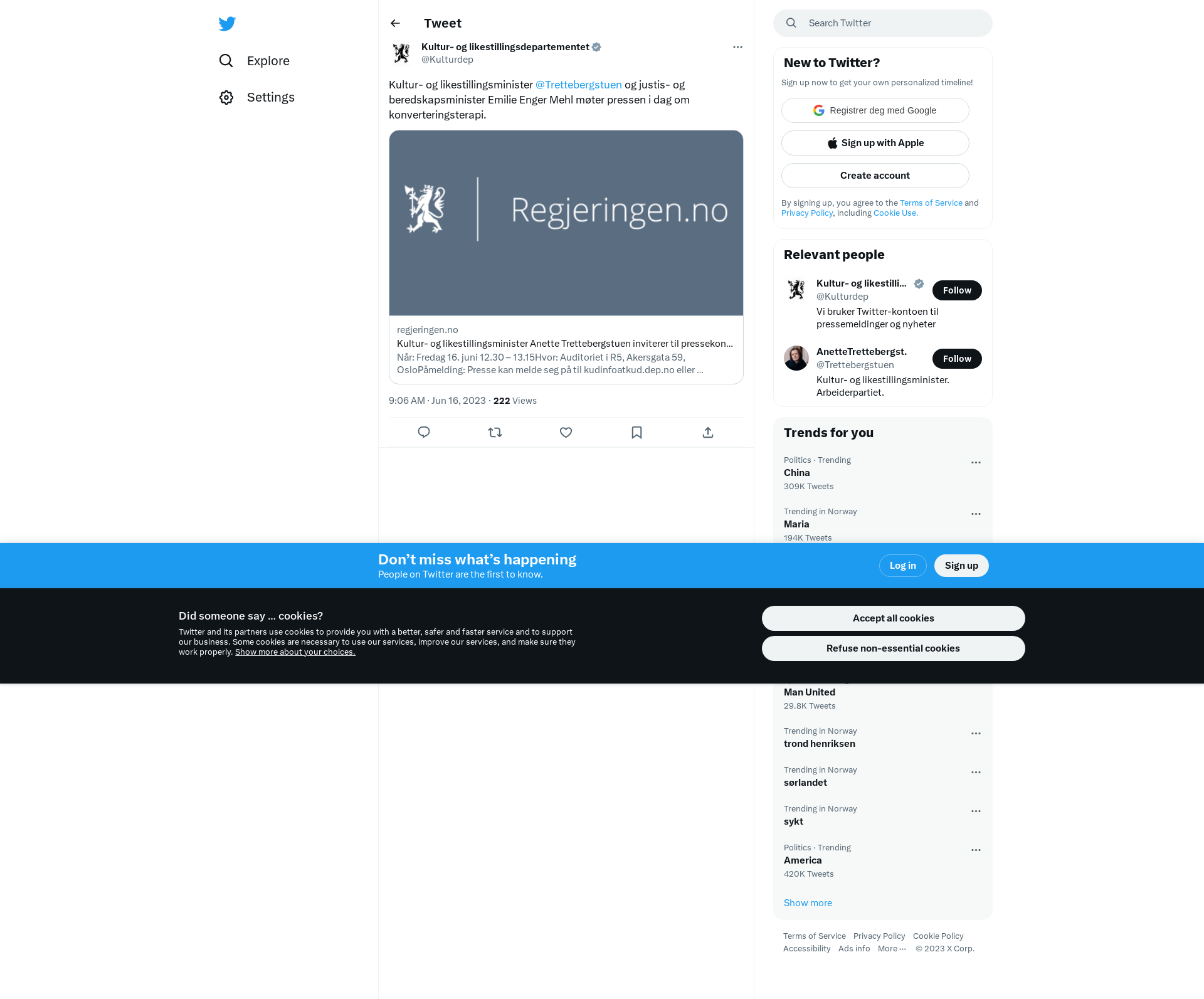 Kultur- og likestillingsminister @Trettebergstuen og justis- og beredskapsminister Emilie Enger Mehl møter pressen i dag om konverteringsterapi. https://t.co/tBGkOvbxXl