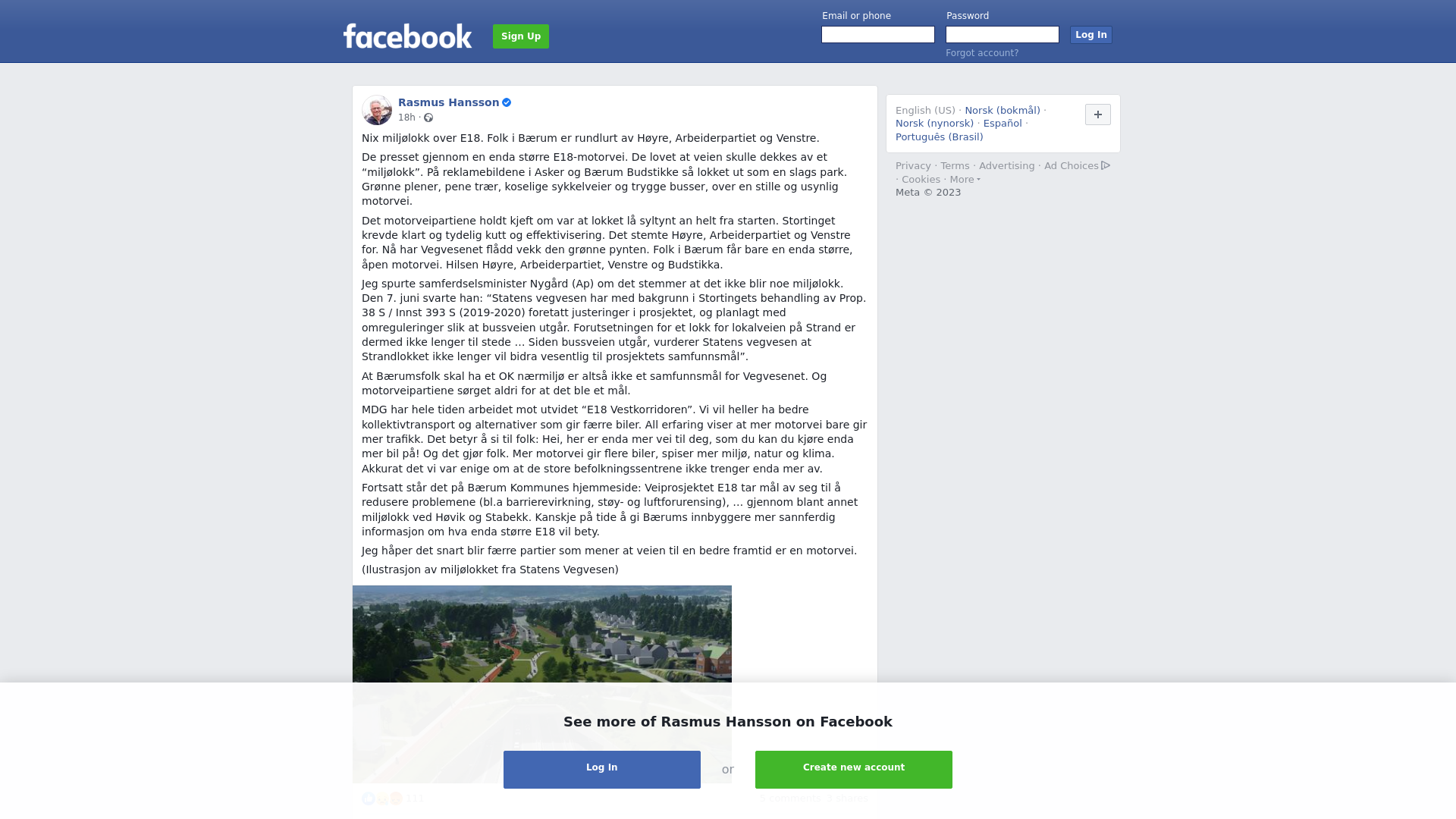 Nix miljølokk over E18. Folk i Bærum er rundlurt av Høyre, Arbeiderpartiet og Venstre. \n\nDe presset gjennom en enda større E18-motorvei. De lovet at veien skulle dekkes av et “miljølokk”. På reklamebildene i Asker og Bærum Budstikke så lokket ut som en slags park. Grønne plener, pene trær, koselige sykkelveier og trygge busser, over en stille og usynlig motorvei. \n\nDet motorveipartiene holdt kjeft om var at lokket lå syltynt an helt fra starten. Stortinget krevde klart og tydelig kutt og effektivisering. Det stemte Høyre, Arbeiderpartiet og Venstre for. Nå har Vegvesenet flådd vekk den grønne pynten. Folk i Bærum får bare en enda større, åpen motorvei. Hilsen Høyre, Arbeiderpartiet, Venstre og Budstikka.\n\nJeg spurte samferdselsminister Nygård (Ap) om det stemmer at det ikke blir noe miljølokk. Den 7. juni svarte han: “Statens vegvesen har med bakgrunn i Stortingets behandling av Prop. 38 S / Innst 393 S (2019-2020) foretatt justeringer i prosjektet, og planlagt med omreguleringer slik at bussveien utgår. Forutsetningen for et lokk for lokalveien på Strand er dermed ikke lenger til stede … Siden bussveien utgår, vurderer Statens vegvesen at Strandlokket ikke lenger vil bidra vesentlig til prosjektets samfunnsmål”. \n\nAt Bærumsfolk skal ha et OK nærmiljø er altså ikke et samfunnsmål for Vegvesenet. Og motorveipartiene sørget aldri for at det ble et mål. \n\nMDG har hele tiden arbeidet mot utvidet “E18 Vestkorridoren”. Vi vil heller ha bedre kollektivtransport og alternativer som gir færre biler. All erfaring viser at mer motorvei bare gir mer trafikk. Det betyr å si til folk: Hei, her er enda mer vei til deg, som du kan du kjøre enda mer bil på! Og det gjør folk. Mer motorvei gir flere biler, spiser mer miljø, natur og klima. Akkurat det vi var enige om at de store befolkningssentrene ikke trenger enda mer av.\n\nFortsatt står det på Bærum Kommunes hjemmeside: Veiprosjektet E18 tar mål av seg til å redusere problemene (bl.a barrierevirkning, støy- og luftforurensing), … gjennom blant annet miljølokk ved Høvik og Stabekk. Kanskje på tide å gi Bærums innbyggere mer sannferdig informasjon om hva enda større E18 vil bety. \n\nJeg håper det snart blir færre partier som mener at veien til en bedre framtid er en motorvei. \n\n(Ilustrasjon av miljølokket fra Statens Vegvesen)
