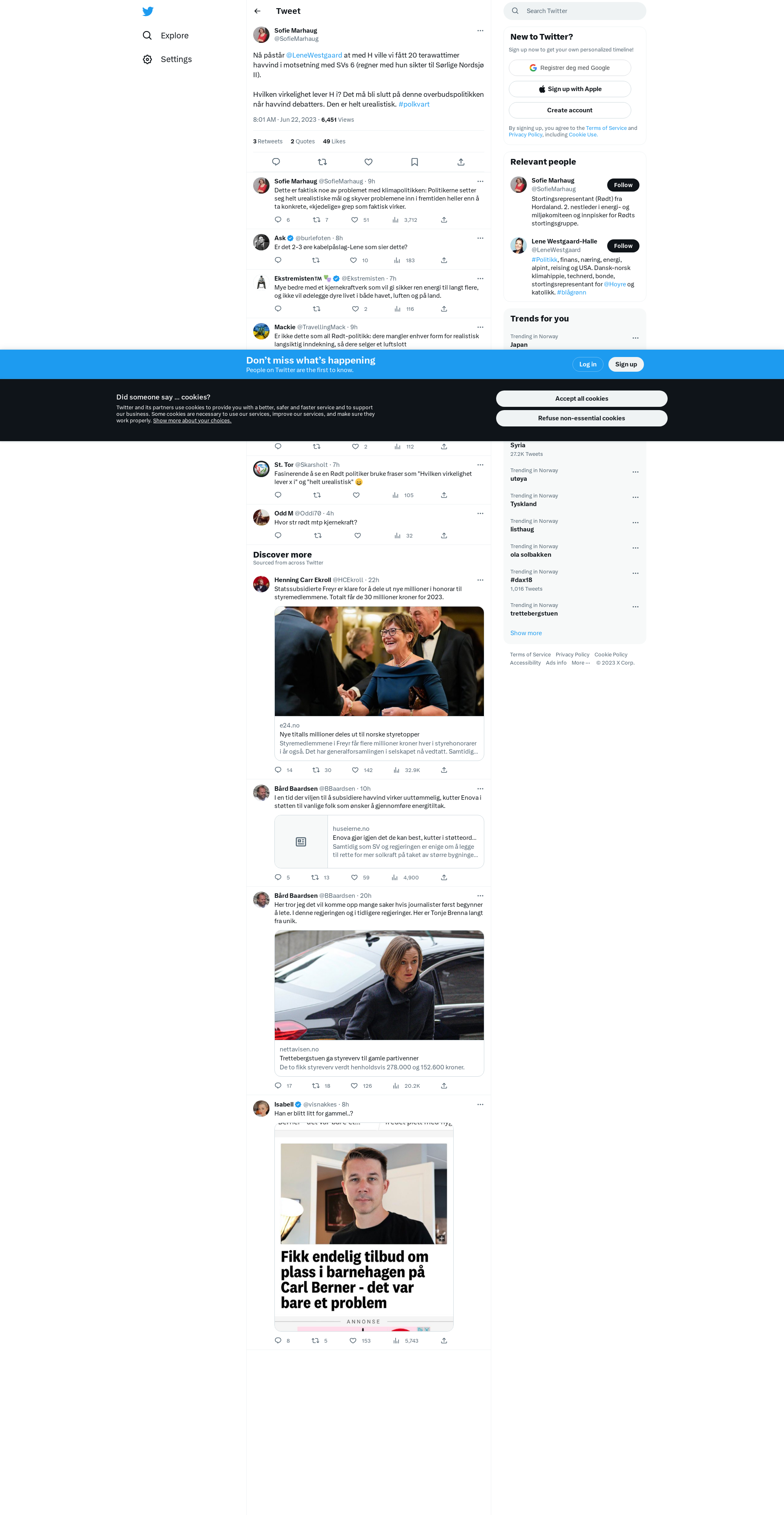 Nå påstår @LeneWestgaard at med H ville vi fått 20 terawattimer havvind i motsetning med SVs 6 (regner med hun sikter til Sørlige Nordsjø II). \n\nHvilken virkelighet lever H i? Det må bli slutt på denne overbudspolitikken når havvind debatters. Den er helt urealistisk. #polkvart