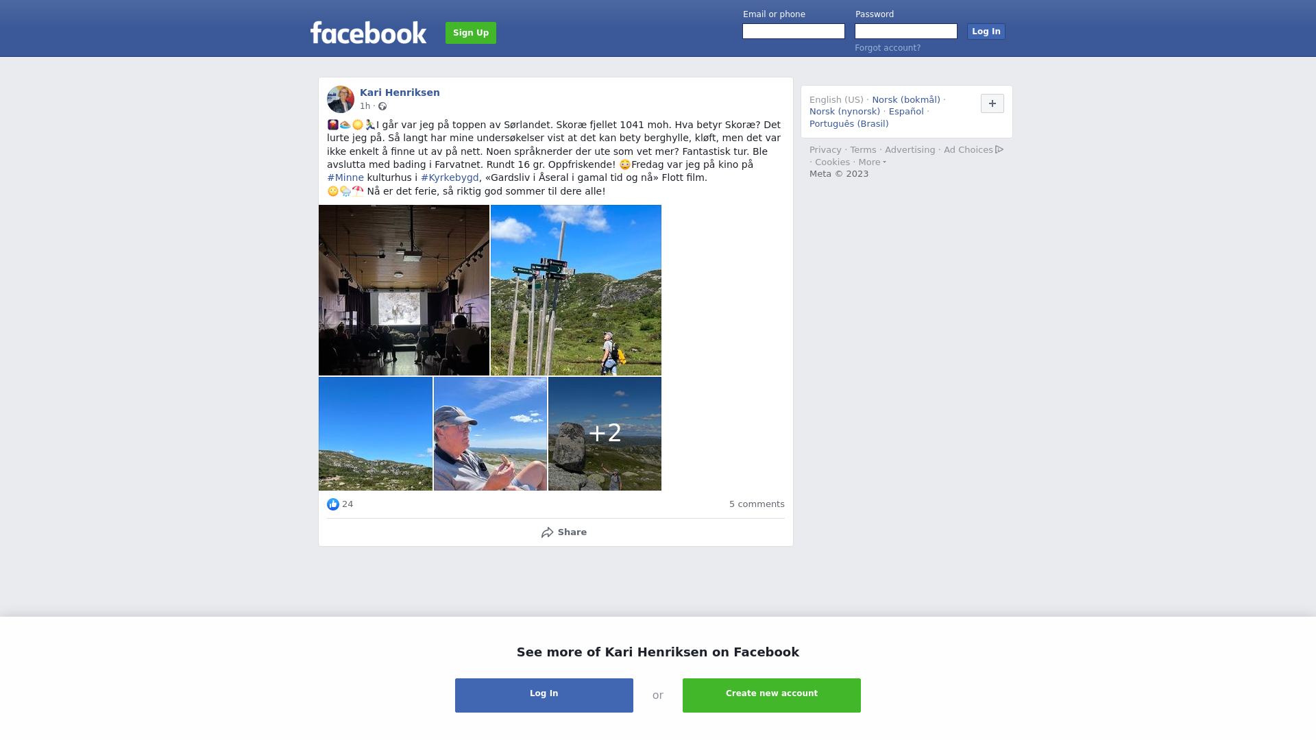 🌋🏊🏽☀️🏃🏻♂️I går var jeg på toppen av Sørlandet. Skoræ fjellet 1041 moh. Hva betyr Skoræ? Det lurte jeg på. Så langt har mine undersøkelser vist at det kan bety berghylle, kløft, men det var ikke enkelt å finne ut av på nett. Noen språknerder der ute som vet mer? Fantastisk tur. Ble avslutta med bading i Farvatnet. Rundt 16 gr. Oppfriskende! 😳Fredag var jeg på kino på #Minne kulturhus i #Kyrkebygd, «Gardsliv i Åseral i gamal tid og nå» Flott film. \n🌞🌦️⛱️ Nå er det ferie, så riktig god sommer til dere alle!