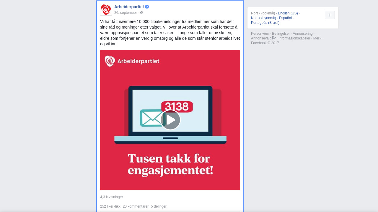 Vi har fått nærmere 10 000 tilbakemeldinger fra medlemmer som har delt sine råd og meninger etter valget. Vi lover at Arbeiderpartiet skal fortsette å være opposisjonspartiet som taler saken til unge som faller ut av skolen, eldre som fortjener en verdig omsorg og alle de som står utenfor arbeidslivet og vil inn.