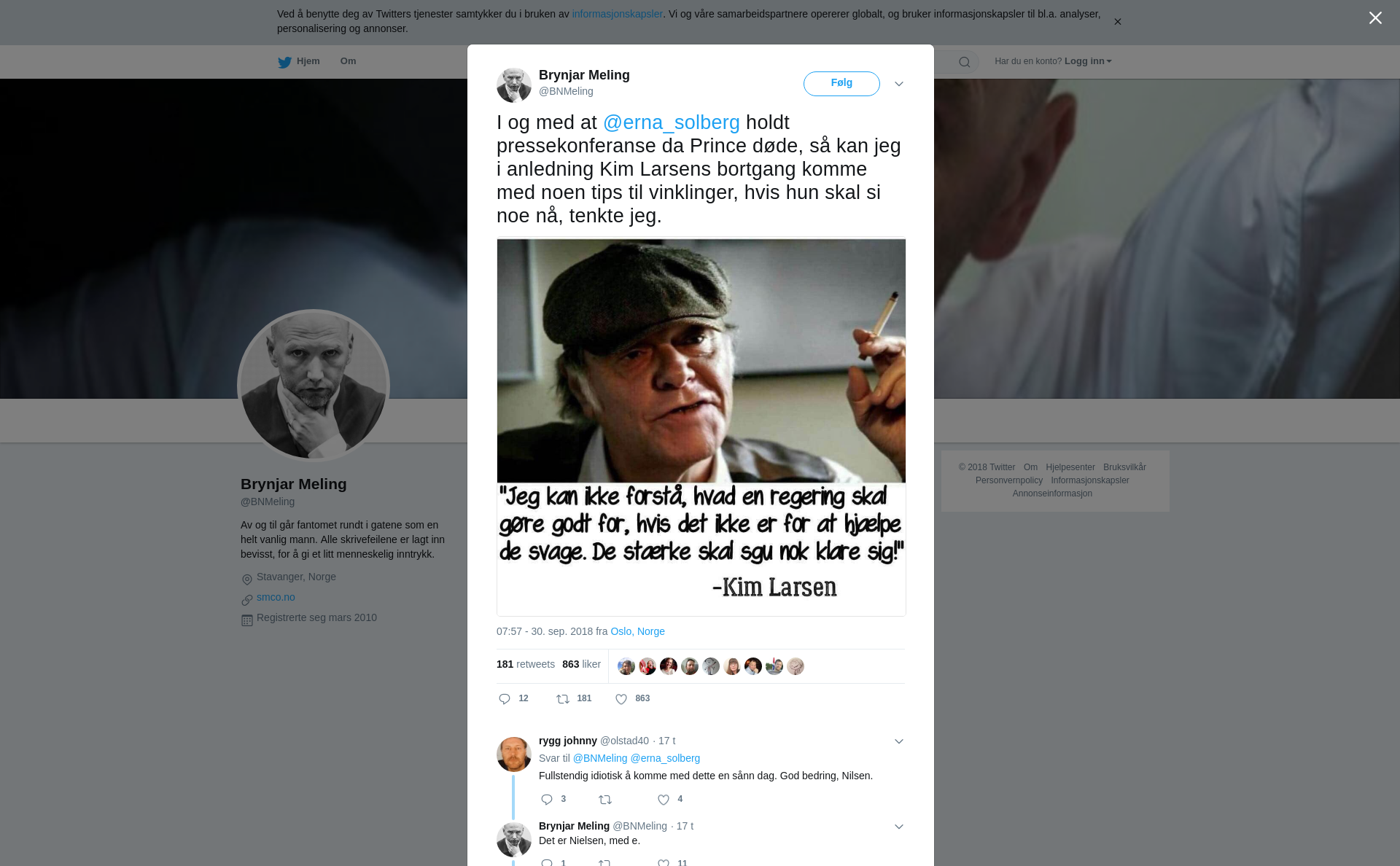 RT @BNMeling: I og med at @erna_solberg holdt pressekonferanse da Prince døde, så kan jeg i anledning Kim Larsens bortgang komme med noen tips til vinklinger, hvis hun skal si noe nå, tenkte jeg. https://t.co/HOXgGcOebr