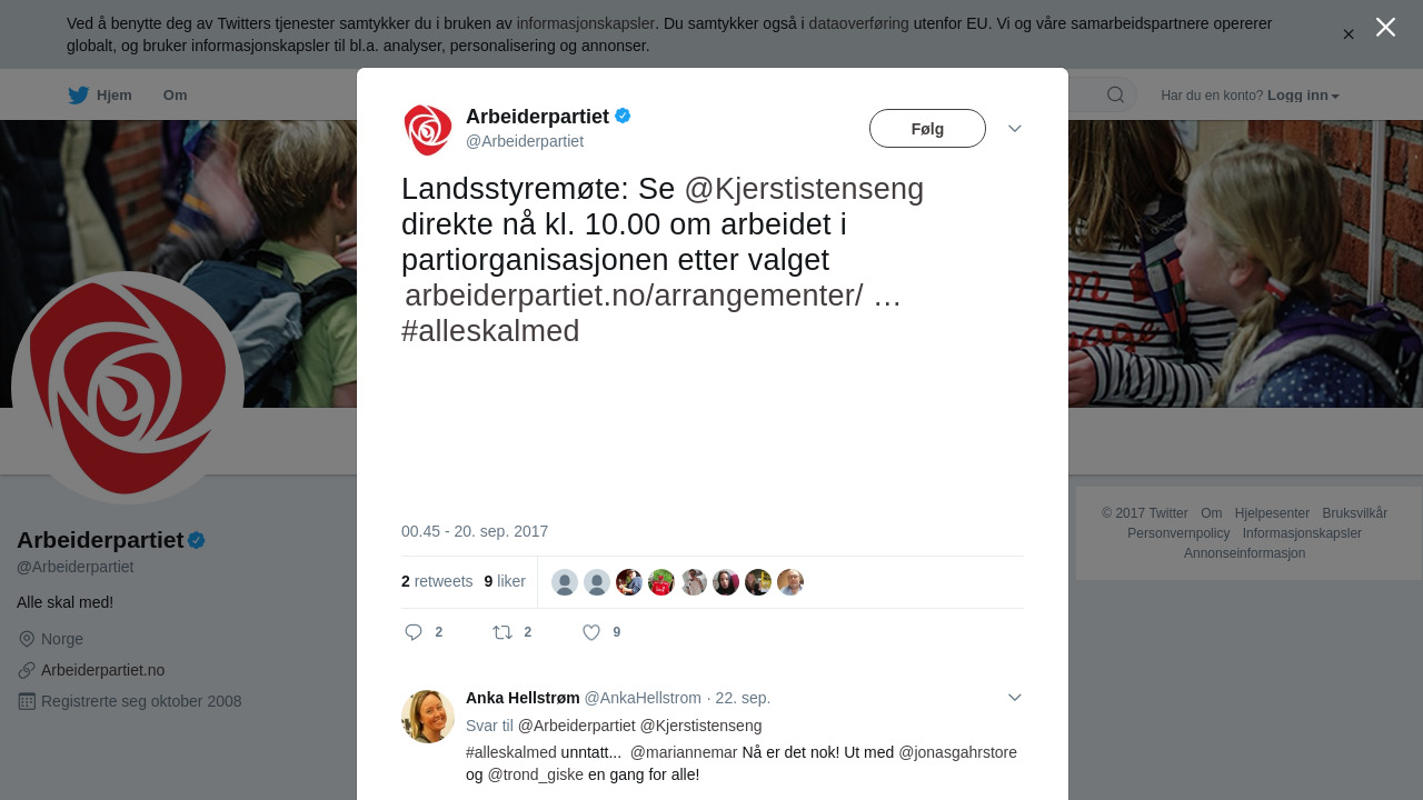 Den politiske situasjonen etter valget. Se Jonas Gahr Støres innledning direkte kl. 13.30. Program tirsdag 19. september Kl. 13.30-14.30 Den politiske situasjon etter valget v/Jonas Gahr Støre Program onsdag 20. september Kl. 10.00-10.45 Arbeidet i partiorganisasjonen etter valget v/Kjersti