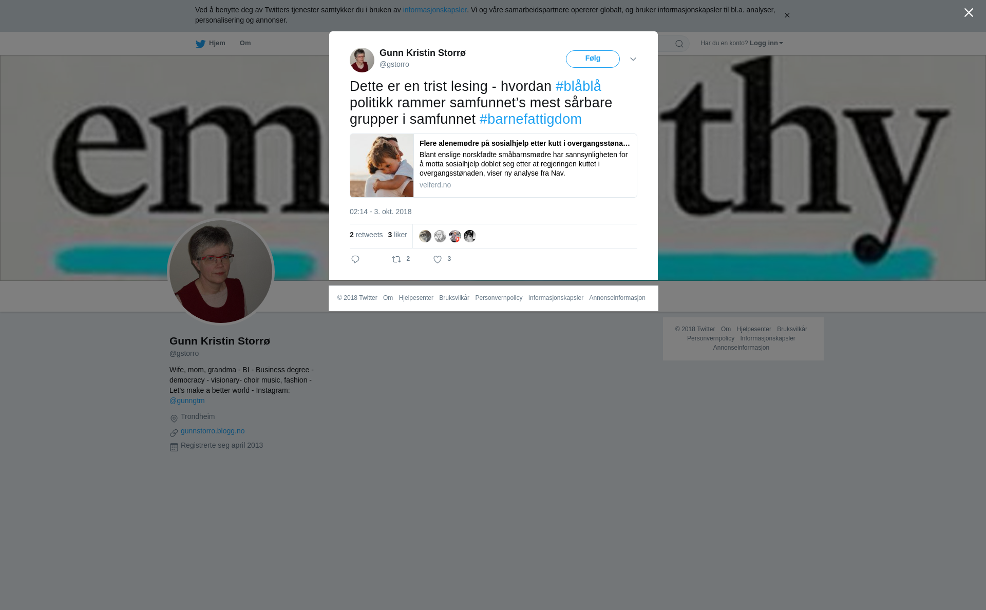 RT @gstorro: Dette er en trist lesing - hvordan #blåblå politikk rammer samfunnet’s mest sårbare grupper i samfunnet #barnefattigdom https://t.co/PZ9WBtiZL4