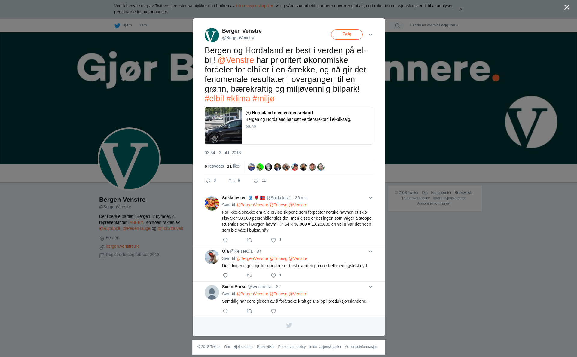 RT @BergenVenstre: Bergen og Hordaland er best i verden på el-bil! @Venstre har prioritert økonomiske fordeler for elbiler i en årrekke, og nå gir det fenomenale resultater i overgangen til en grønn, bærekraftig og miljøvennlig bilpark! #elbil #klima #miljø https://t.co/tBmprv00Su