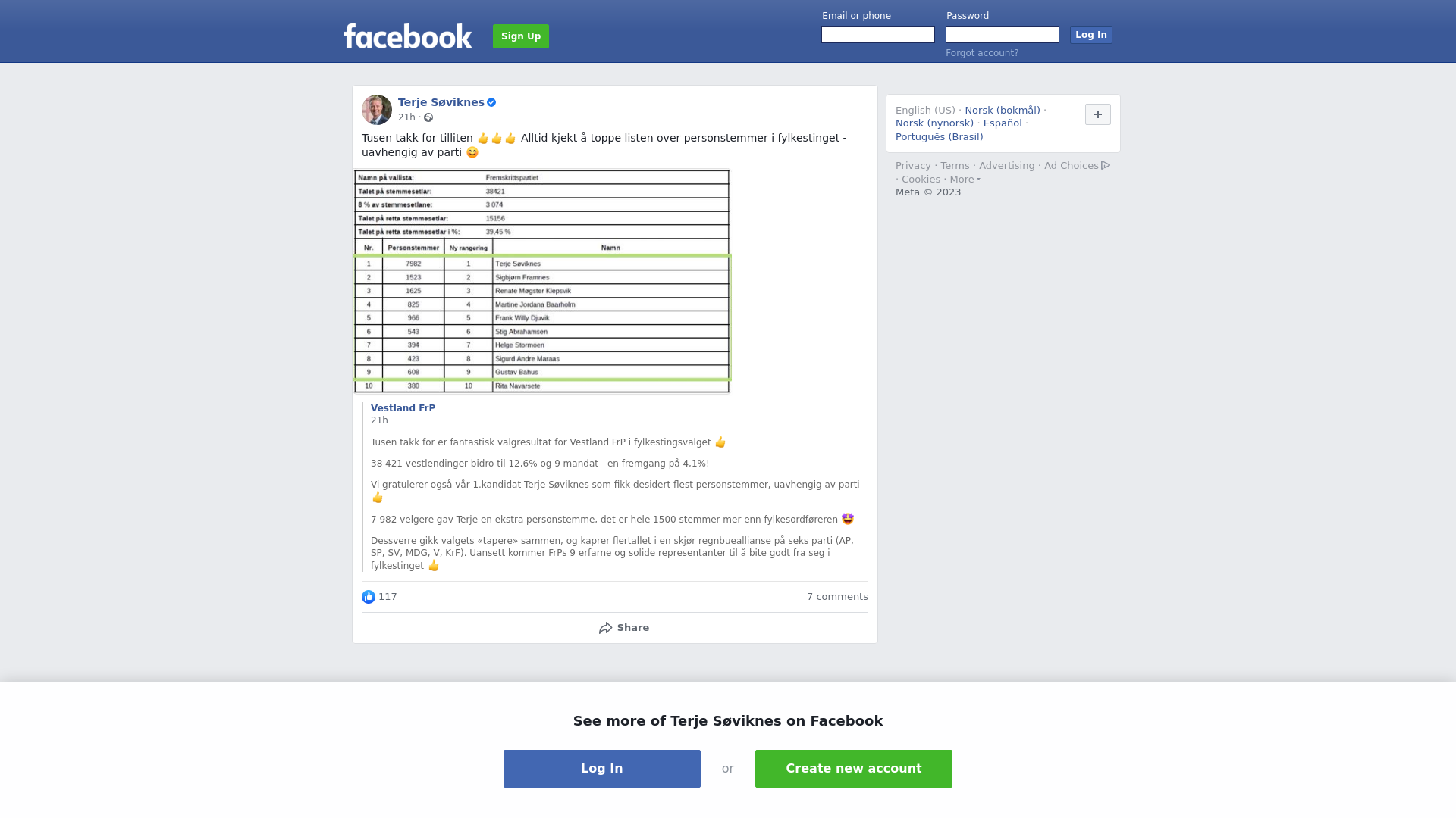 Tusen takk for er fantastisk valgresultat for Vestland FrP i fylkestingsvalget 👍\n\n38 421 vestlendinger bidro til 12,6% og 9 mandat - en fremgang på 4,1%! \n\nVi gratulerer også vår 1.kandidat Terje Søviknes som fikk desidert flest personstemmer, uavhengig av parti 👍 \n\n7 982 velgere gav Terje en ekstra personstemme, det er hele 1500 stemmer mer enn fylkesordføreren 🤩\n\nDessverre gikk valgets «tapere» sammen, og kaprer flertallet i en skjør regnbueallianse på seks parti (AP, SP, SV, MDG, V, KrF). Uansett kommer FrPs 9 erfarne og solide representanter til å bite godt fra seg i fylkestinget 👍