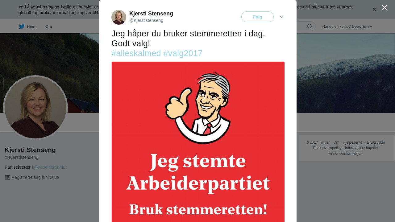 RT @Kjerstistenseng: Jeg håper du bruker stemmeretten i dag. Godt valg! #alleskalmed #valg2017 https://t.co/Z2JO8KTV8n