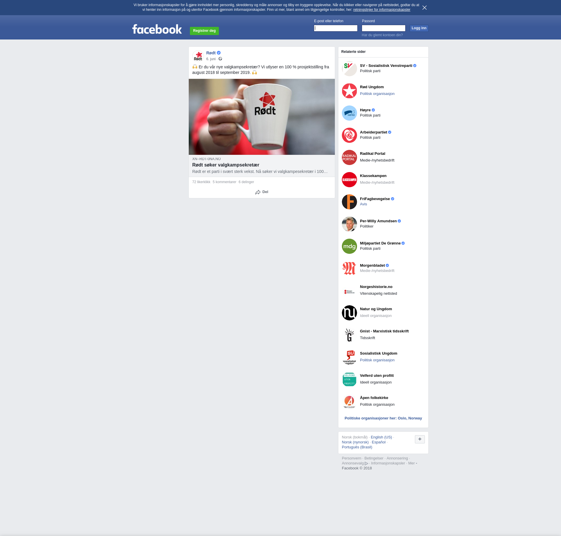 Rødt er et parti i svært sterk vekst. Nå søker vi valgkampesekretær i 100% prosjektstilling ut september 2019. Vi søker en engasjert medarbeider med erfaring fra og interesse for politisk organisering.