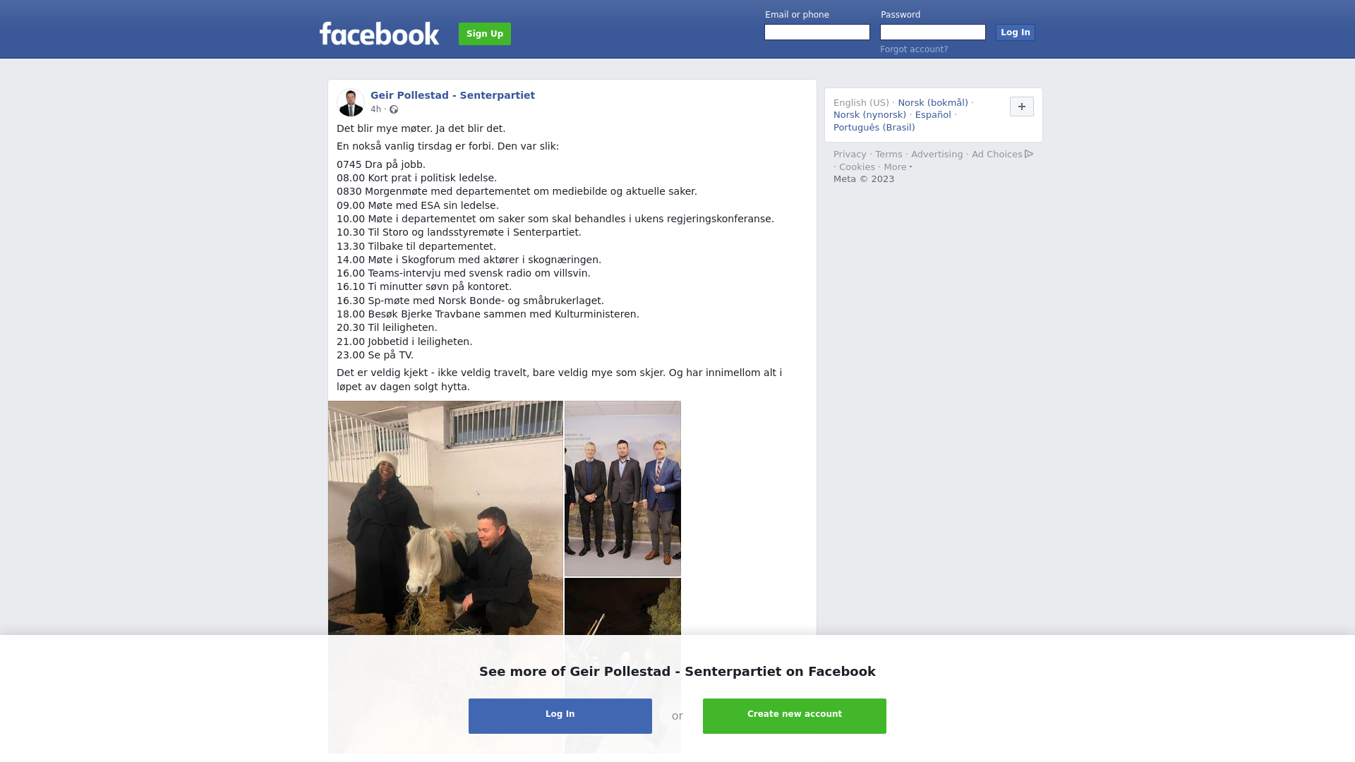 Det blir mye møter. Ja det blir det.\n\nEn nokså vanlig tirsdag er forbi. Den var slik: \n\n0745 Dra på jobb. \n08.00 Kort prat i politisk ledelse. \n0830 Morgenmøte med departementet om mediebilde og aktuelle saker. \n09.00 Møte med ESA sin ledelse. \n10.00 Møte i departementet om saker som skal behandles i ukens regjeringskonferanse. \n10.30 Til Storo og landsstyremøte i Senterpartiet. \n13.30 Tilbake til departementet. \n14.00 Møte i Skogforum med aktører i skognæringen. \n16.00 Teams-intervju med svensk radio om villsvin. \n16.10 Ti minutter søvn på kontoret. \n16.30 Sp-møte med Norsk Bonde- og småbrukerlaget. \n18.00 Besøk Bjerke Travbane sammen med Kulturministeren. \n20.30 Til leiligheten. \n21.00 Jobbetid i leiligheten.\n23.00 Se på TV. \n\nDet er veldig kjekt - ikke veldig travelt, bare veldig mye som skjer. Og har innimellom alt i løpet av dagen solgt hytta.