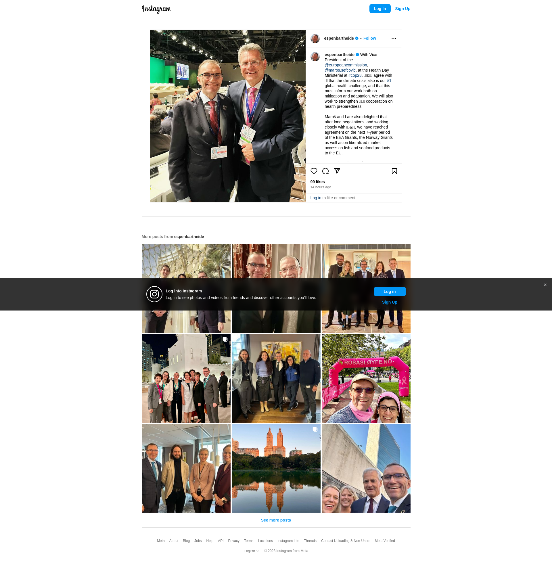 With Vice President of the @europeancommission, @maros.sefcovic, at the Health Day Ministerial at #cop28. 🇪🇺&🇳🇴 agree with 🇺🇳 that the climate crisis also is our #1 global health challenge, and that this must inform our work both on mitigation and adaptation. We will also work to strengthen 🇪🇺🇳🇴 cooperation on health preparedness. \n\nMaroš and I are also delighted that after long negotiations, and working closely with 🇱🇮&🇮🇸, we have reached agreement on the next 7-year period of the EEA Grants, the Norway Grants as well as on liberalized market access on fish and seafood products to the EU. \n\nUpwards and onwards!