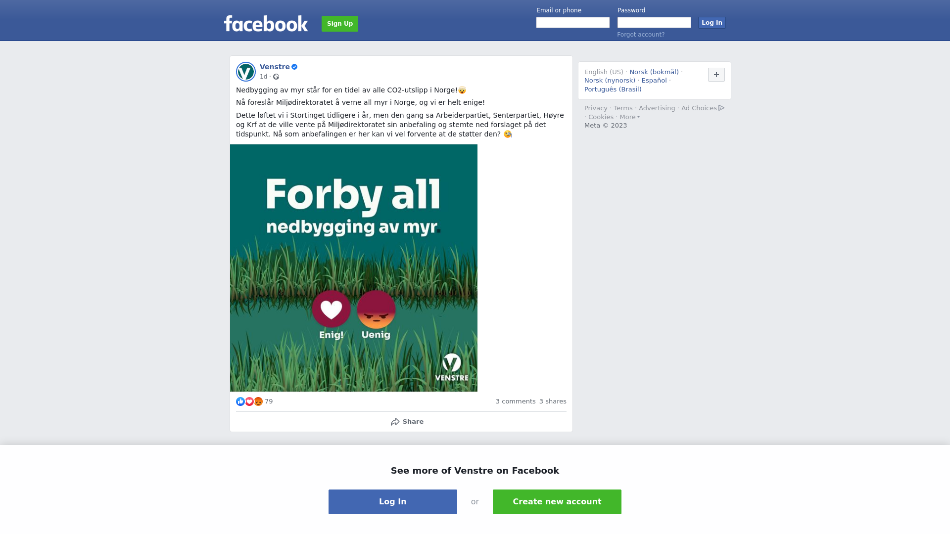 Nedbygging av myr står for en tidel av alle CO2-utslipp i Norge!🤯 \n\nNå foreslår Miljødirektoratet å verne all myr i Norge, og vi er helt enige! \n\nDette løftet vi i Stortinget tidligere i år, men den gang sa Arbeiderpartiet, Senterpartiet, Høyre og Krf at de ville vente på Miljødirektoratet sin anbefaling og stemte ned forslaget på det tidspunkt. Nå som anbefalingen er her kan vi vel forvente at de støtter den? 🧐