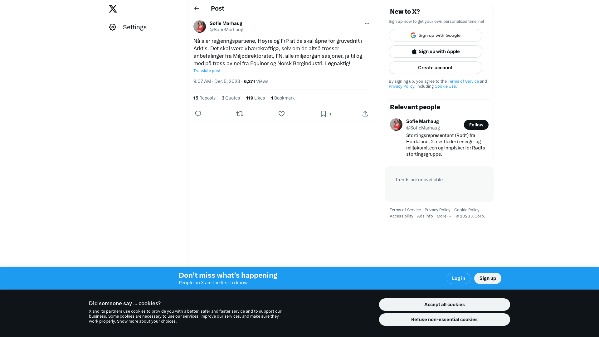 Nå sier regjeringspartiene, Høyre og FrP at de skal åpne for gruvedrift i Arktis. Det skal være «bærekraftig», selv om de altså trosser anbefalinger fra Miljødirektoratet, FN, alle miljøorganisasjoner, ja til og med på tross av nei fra Equinor og Norsk Bergindustri. Løgnaktig!