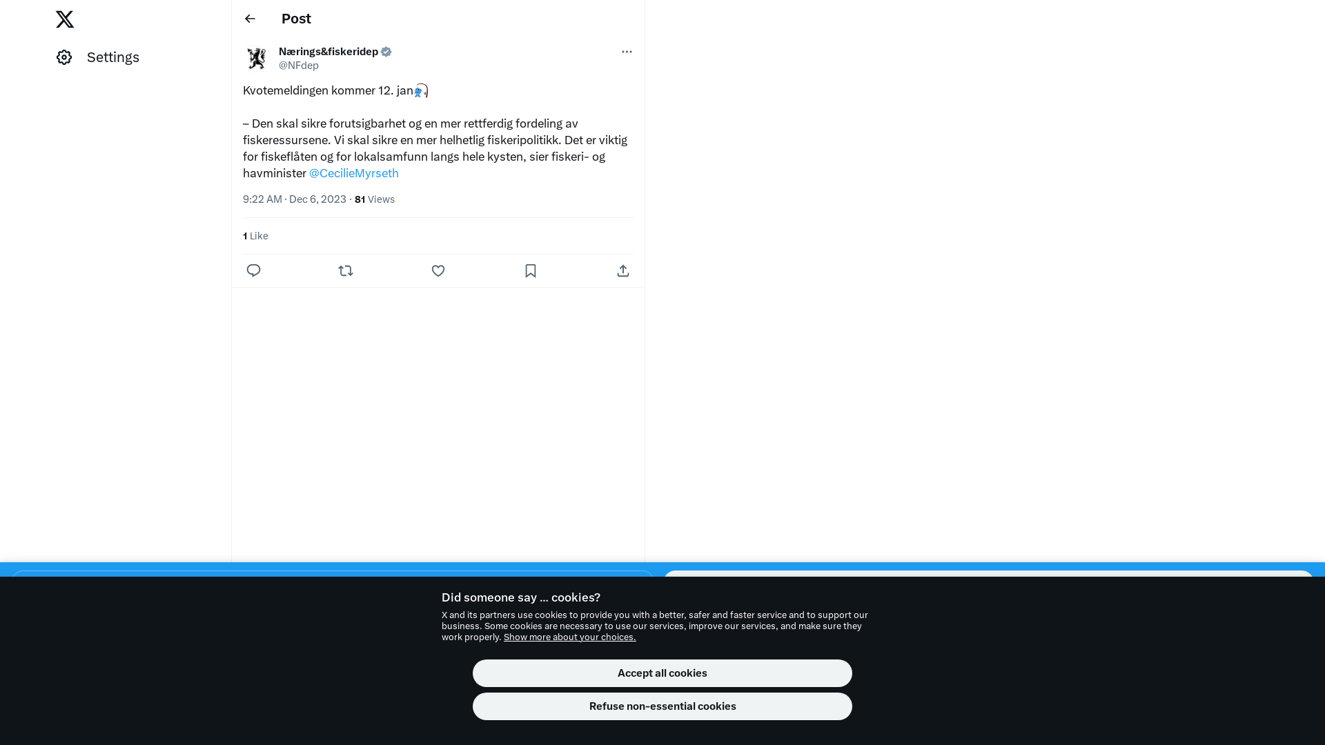 Kvotemeldingen kommer 12. jan🎣\n\n– Den skal sikre forutsigbarhet og en mer rettferdig fordeling av fiskeressursene. Vi skal sikre en mer helhetlig fiskeripolitikk. Det er viktig for fiskeflåten og for lokalsamfunn langs hele kysten, sier fiskeri- og havminister @CecilieMyrseth