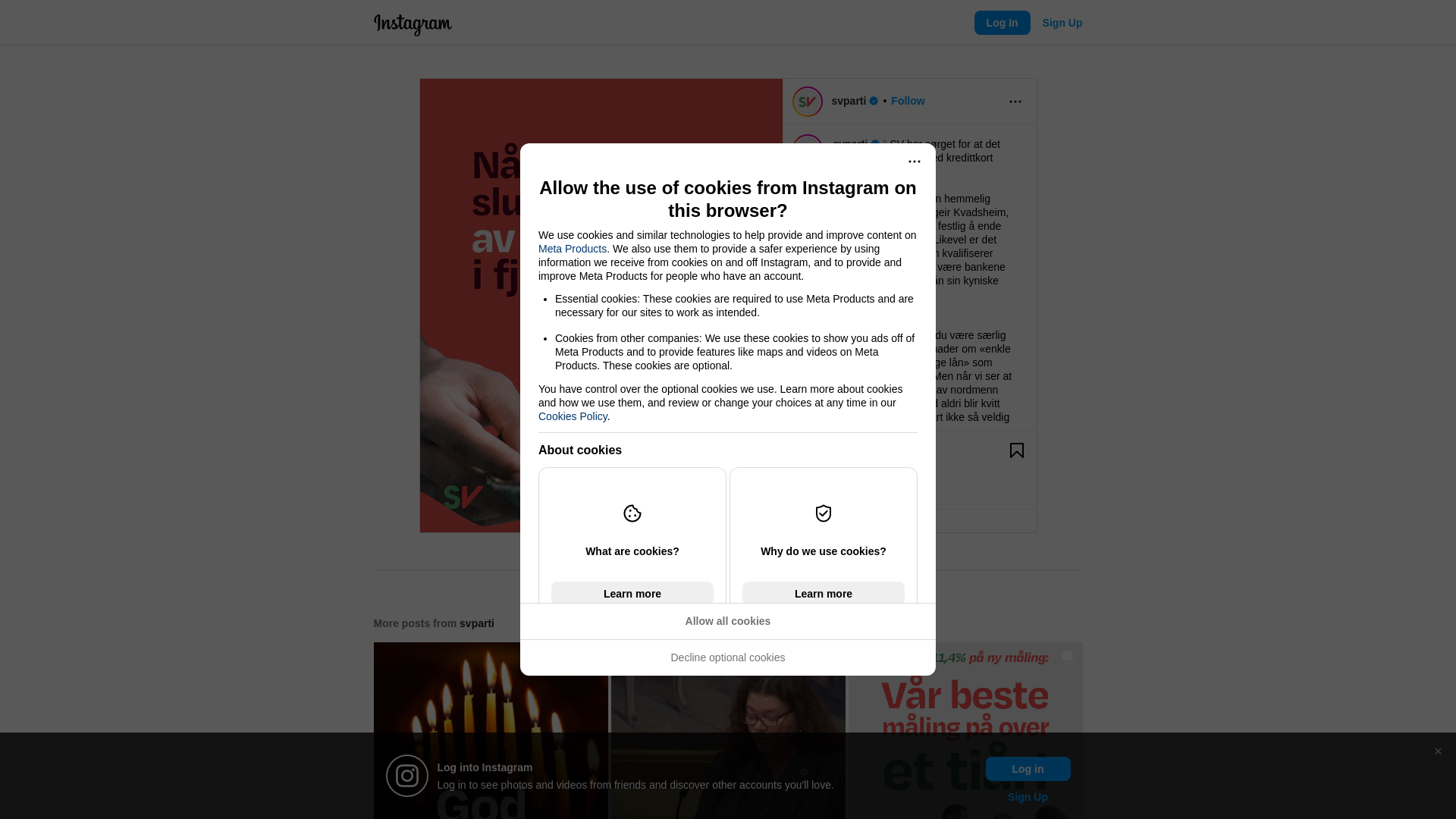 ✋ SV har sørget for at det blir forbudt å veive med kredittkort oppi fjeset på folk.\n\n💸 Ved mindre du har en hemmelig drøm om å møte Hallgeir Kvadsheim, så er det ikke spesielt festlig å ende opp på Luksusfellen. Likevel er det mange nordmenn som kvalifiserer seg, i stor grad takket være bankene som pusher forbrukslån sin kyniske markedsføring.\n\n💰 Dersom du først har pengeproblemer skal du være særlig sterk for å motstå lovnader om «enkle løsninger» og «gunstige lån» som bransjen frister med. Men når vi ser at nesten tre fjerdedeler av nordmenn med høy forbruksgjeld aldri blir kvitt den, så er det åpenbart ikke så veldig gunstig likevel.\n\n🛑 Derfor er det med stor glede vi kan si: Nå blir det endelig et reklameforbud for kredittkort og forbrukslån!