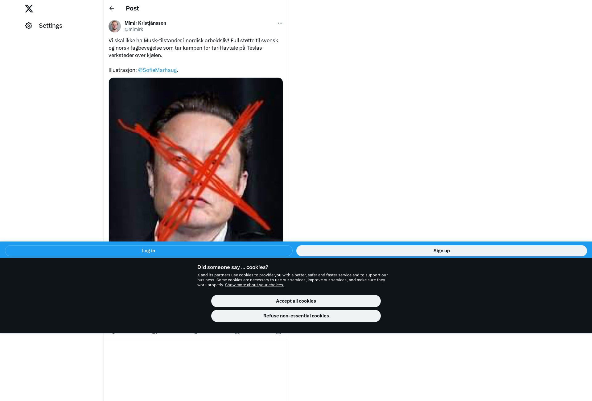 Vi skal ikke ha Musk-tilstander i nordisk arbeidsliv! Full støtte til svensk og norsk fagbevegelse som tar kampen for tariffavtale på Teslas verksteder over kjølen. \n\nIllustrasjon: @SofieMarhaug. https://t.co/adRTPtwNjr