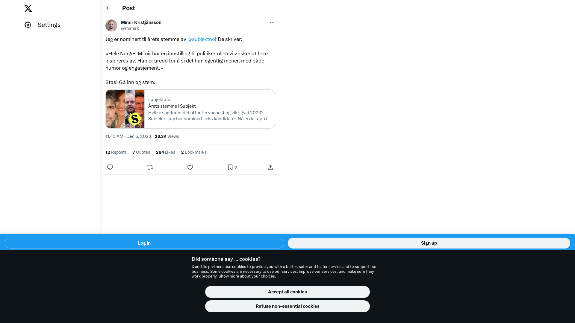 Jeg er nominert til årets stemme av @subjektno! De skriver: \n\n«Hele Norges Mímir har en innstilling til politikerrollen vi ønsker at flere inspireres av. Han er uredd for å si det han egentlig mener, med både humor og engasjement.»\n\nStas! Gå inn og stem: https://t.co/oHk1VwlUYM