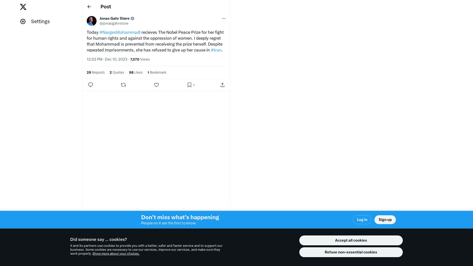 Today #NargesMohammadi recieves The Nobel Peace Prize for her fight for human rights and against the oppression of women. I deeply regret that Mohammadi is prevented from receiveing the prize herself. Despite repeated imprisonments, she has refused to give up her cause in #Iran.