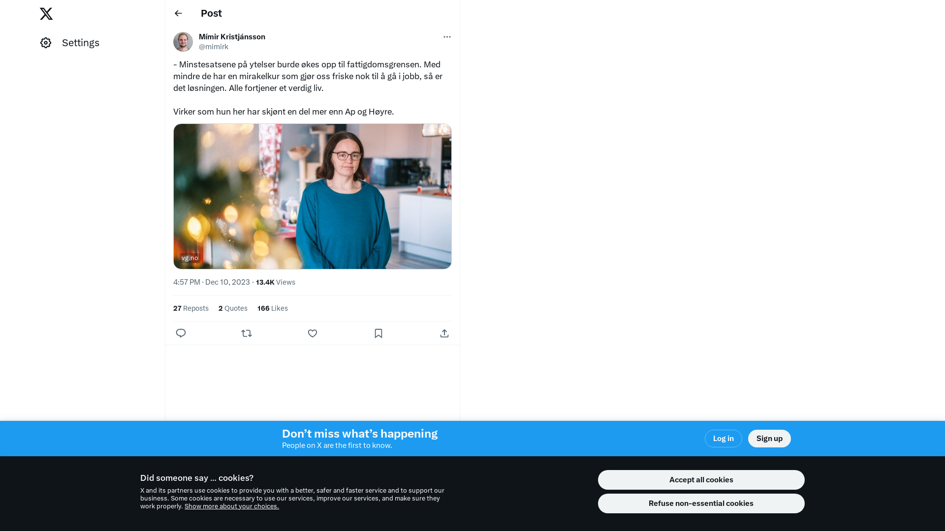 - Minstesatsene på ytelser burde økes opp til fattigdomsgrensen. Med mindre de har en mirakelkur som gjør oss friske nok til å gå i jobb, så er det løsningen. Alle fortjener et verdig liv.\n\nVirker som hun her har skjønt en del mer enn Ap og Høyre.\n\nhttps://t.co/FydvCix7Mz