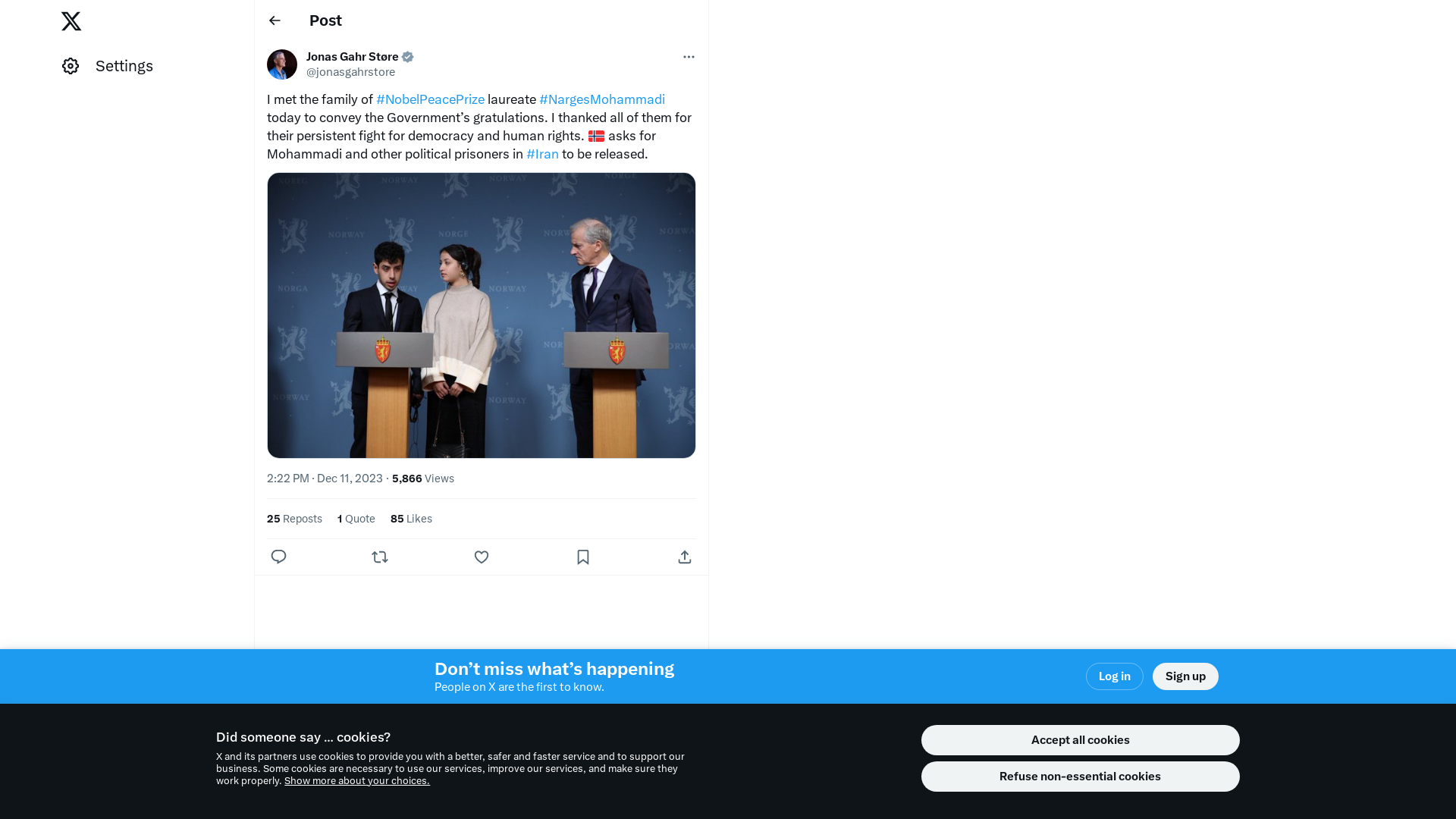 I met the family of #NobelPeacePrize laureate #NargesMohammadi today to convey the Government’s gratulations. I thanked all of them for their persistent fight for democracy and human rights. 🇳🇴 asks for Mohammadi and other political prisoners in #Iran to be released. https://t.co/ZJaAd09v9j
