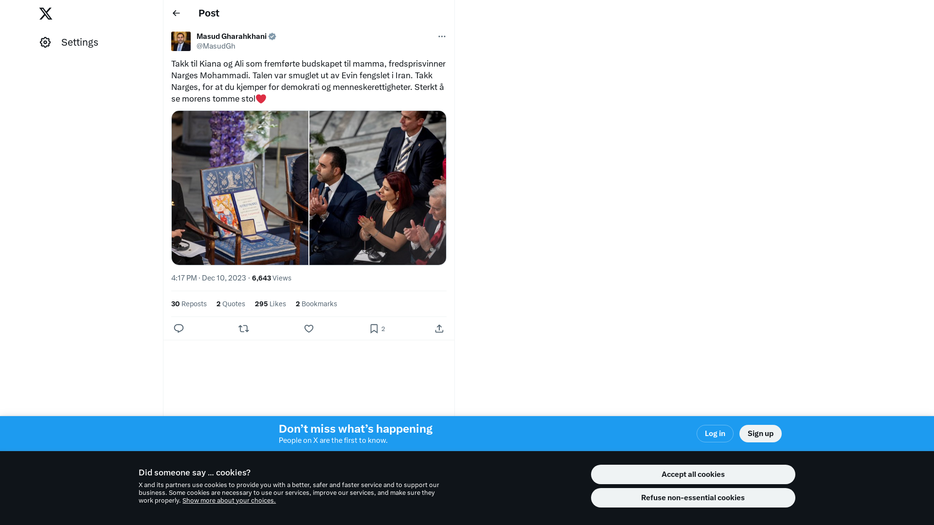 Takk til Kiana og Ali som fremførte budskapet til mamma, fredsprisvinner Narges Mohammadi. Talen var smuglet ut av Evin fengslet i Iran. Takk Narges, for at du kjemper for demokrati og menneskerettigheter. Sterkt å se morens tomme stol❤️ https://t.co/6B7dBn3ZzQ