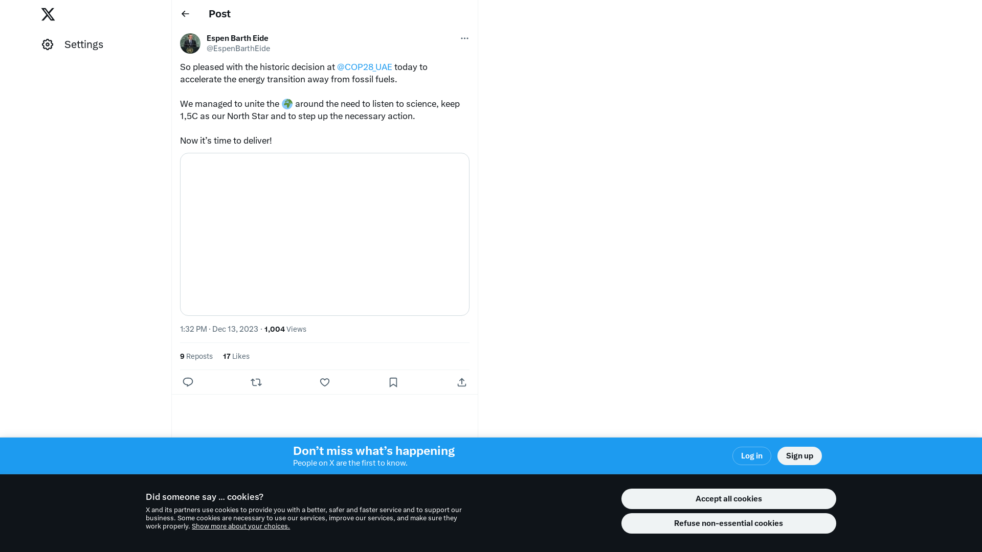 So pleased with the historic decision at @COP28_UAE today to accelerate the energy transition away from fossil fuels. \n\nWe managed to unite the 🌍 around the need to listen to science, keep 1,5C as our North Star and to step up the necessary action. \n\nNow it’s time to deliver! https://t.co/hvqRKj7Chb